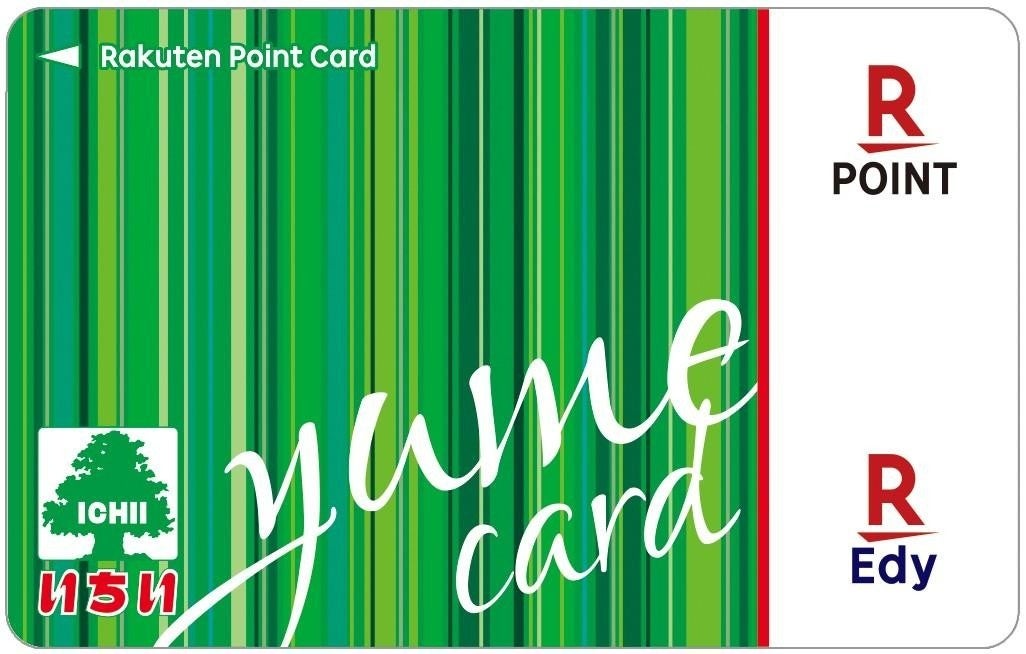 いちいは、これまで導入していたいちいの自社ポイントカード「夢カード」のサービスを順次終了し、「楽天ポイントカード」と「楽天Edy」機能を搭載したオリジナルデザイン「yumeカード」への切り替えを行います。これにより利用者は、対象店舗にて「yumeカード」をはじめとする「楽天ポイントカード」または「楽天ポイントカード」機能が搭載されたアプリを提示すると、利用金額に応じて「楽天ポイント」を貯めることができ、貯まったポイントを支払い時に使用することができます。また、「楽天Edy」で支払いをすると、利用金額に応じて「楽天ポイント」が進呈されます。