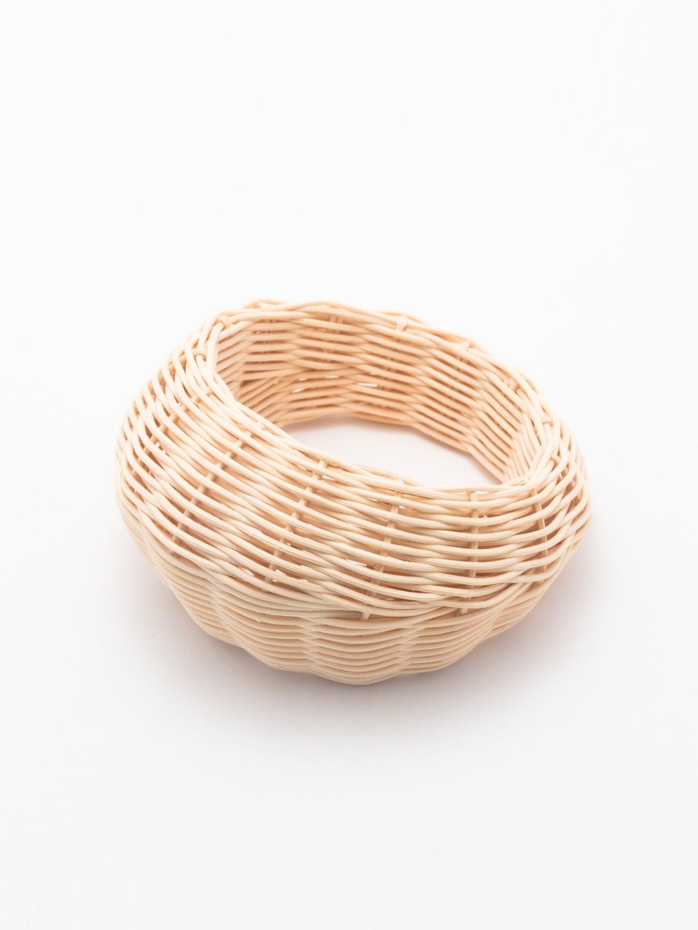 日本を代表するインテリアデザイナー、剣持勇のラタンチェアにインスパイアされて生まれたバングルARABESQUE Bangle 1は、世界でも有数の籐(とう)工芸職人が籐を1本1本磨き上げ、アクセサリーへと昇華しています。内側まで編み込むことによってスムースなつけ心地に仕上げ、立体的なフォルムに、トップのエッジが引き締まった印象をもたせてくれます。