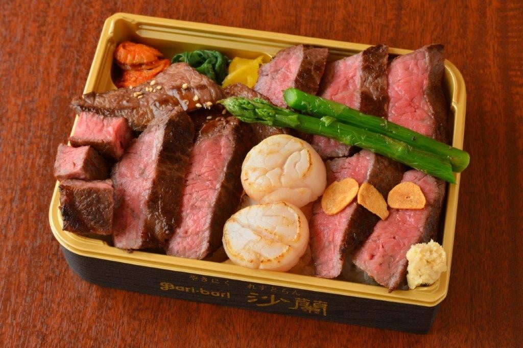 はこだて大沼黒牛のサーロイン・ウチモモ・ランプ・イチボのステーキと北海道産ホタテのステーキも盛り合わせたお弁当です。