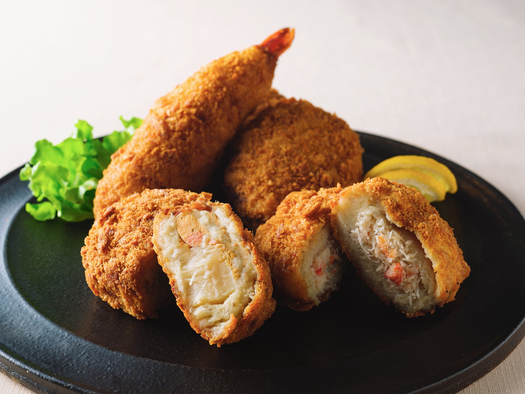 えび、かに、ほたてのそれぞれを男爵いもでまるごと包み込んだおいしいコロッケです。