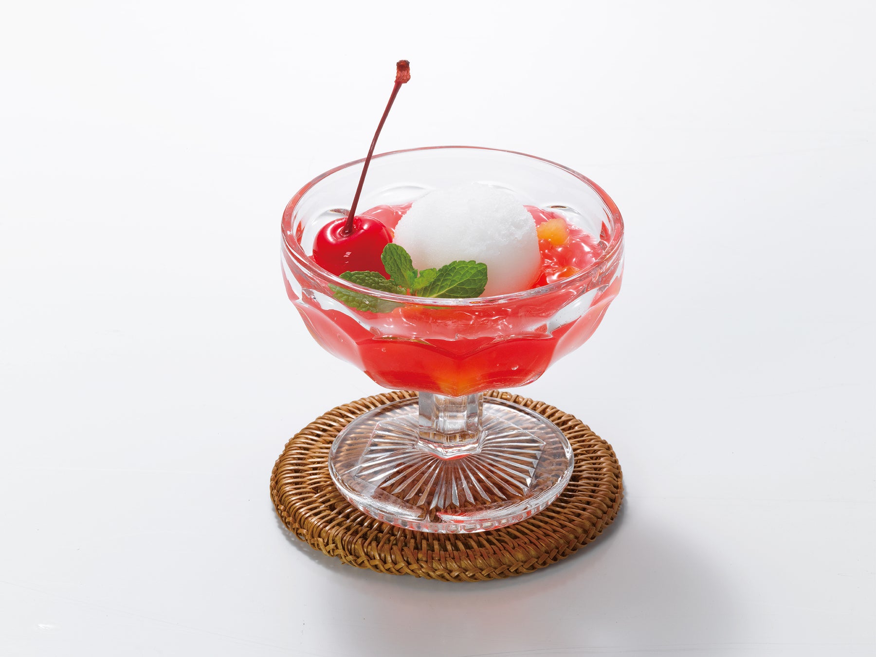 シンガポールスリングは1915年にシンガポールのラッフルズ・ホテルのロングバーのチーフバーテンダーが作ったとされるカクテルです。そのカクテルのようにシンガポールの夕焼けを想わせるエレガントな色合いに、ライチシャーベットの甘み、さわやかな酸味あるゼリーを合わせたノンアルコールのプチパフェをお楽しみください。