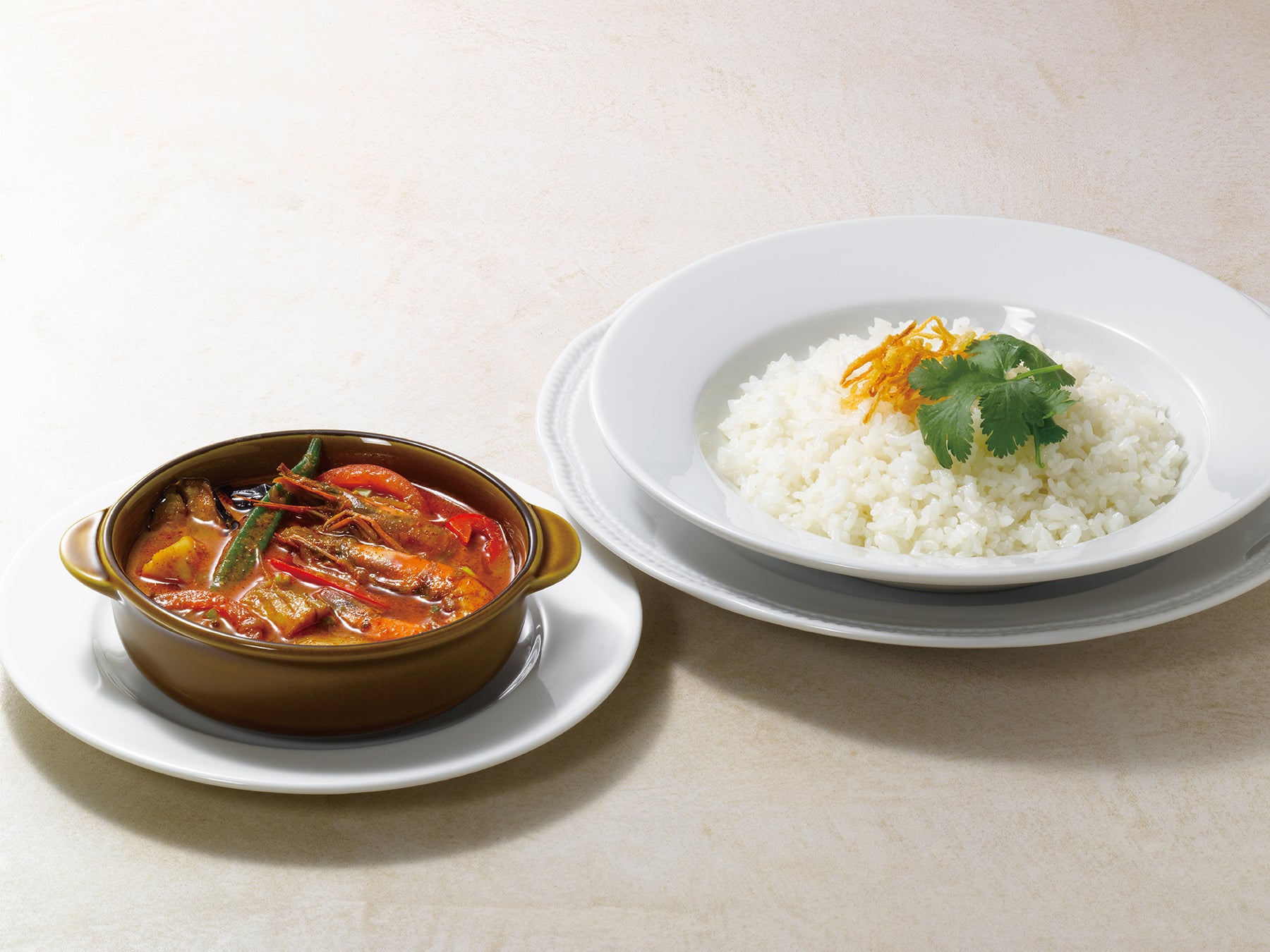 日本でも人気のシンガポールを代表する料理です。本来は柔らかくゆでた鶏肉とそのスープでご飯を炊きますが、本フェアでは国産「みつせ鶏」のむね肉を柔らかくしっとり蒸しあげ、香り高いジャスミンライスを添えました。生姜ソースやガーリック入りのチリソース、甘じょっぱいダークソイソースをつけてお召し上がりください。