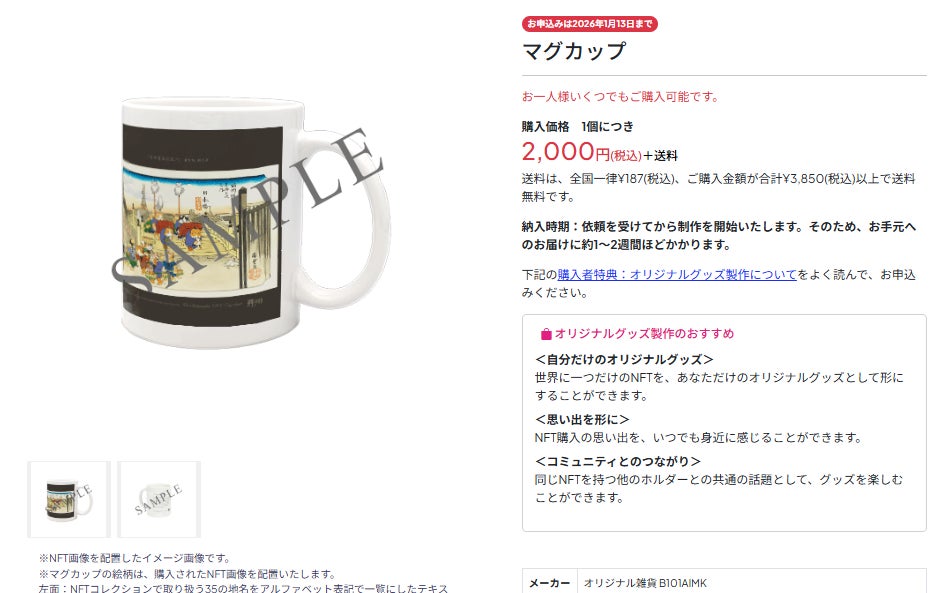 ユーザーは、自身のNFTアート——たとえば世界的クリエイターShu Yamamoto氏の『猫街道三拾三次』シリーズなど——を、 「「オリジナル雑貨」へと即座に変換。