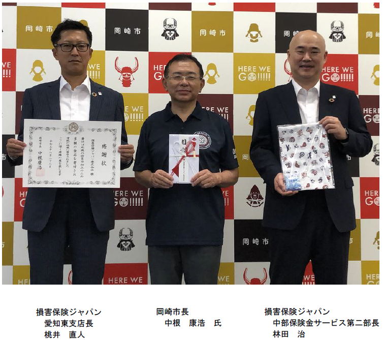損害保険ジャパン株式会社(代表取締役社長:白川 儀一、以下「損保ジャパン」)は、岡崎市(市長:中根 康浩)と締結した「包括連携協定」に基づき、災害用備蓄品として「災害用トイレ(1,000点)、防災用手ぬぐい(500点)」を贈呈しました。