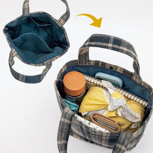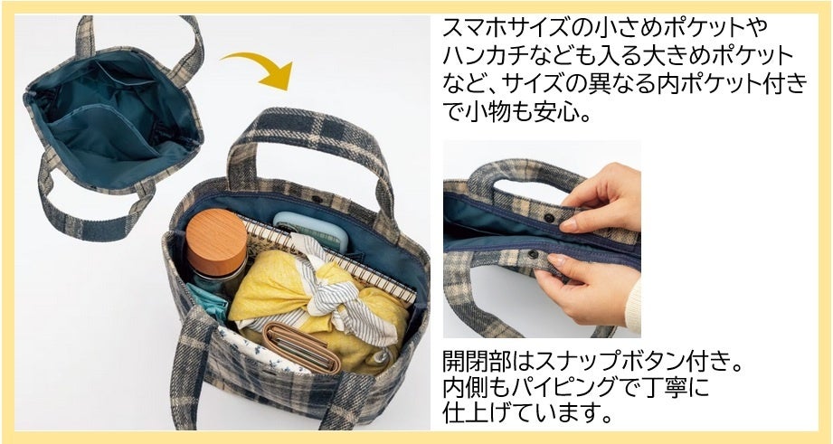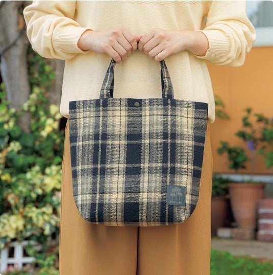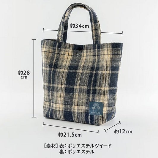 冬のコーディネートにも合わせやすい、クラシックなネイビーチェックに心がときめくトートバッグ。バッグの表面のガーベラをあしらったデザインタグが可愛い♪サイズの異なる内ポケット付きなので、スマホ、財布、水筒、お弁当箱が収納できるトートバッグは、底部分にたっぷりマチがあるのでしっかり自立します。通勤、お買い物などに、是非ご利用ください。