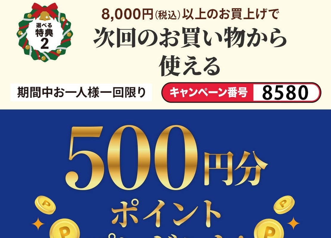 キャンペーン番号「8580」。期間中お一人さま1回限り。ポイントは次回のお買い物からご利用いただけます。