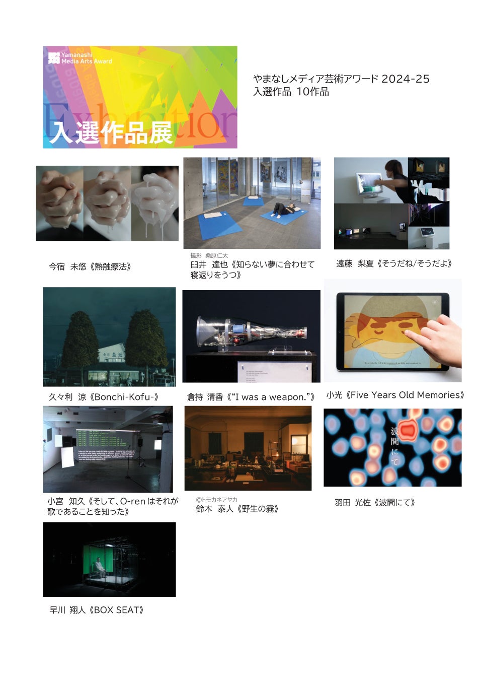 山梨県(知事:長崎幸太郎)では、アーティストのキャリア形成を促進すると共に、本県での創作活動の契機とするため、『やまなしメディア芸術アワード(以下、YMAA)』を開催しています。今年度で4回目となるYMAAは「YAMANASHI MEDIA ART PROJECT」と題し、県内各地を舞台に次世代のアーティスト達が、テクノロジーを駆使しながらアート作品を通じて山梨から未来へ大胆な提案を投げかけます。