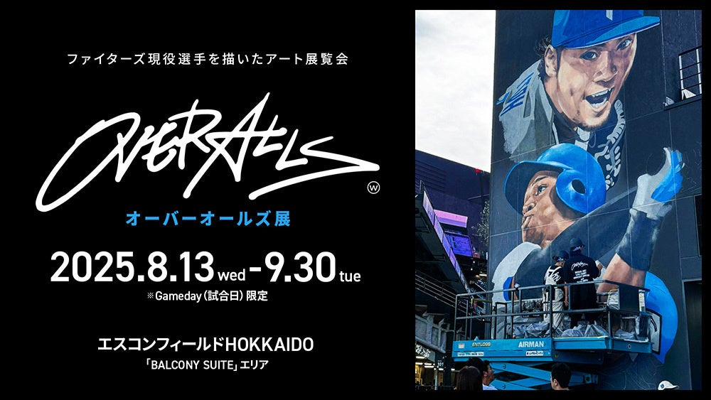 手掛けたのは、「TOWER 11(タワー・イレブン)」1F FIELD LEVELコンコース側の壁面にダルビッシュ有投手、大谷翔平選手を描いた「OVER ALLs(オーバーオールズ)」。北海道日本ハムファイターズの投打の顔である伊藤大海投手、万波中正選手を躍動感ある構図で表現しています。