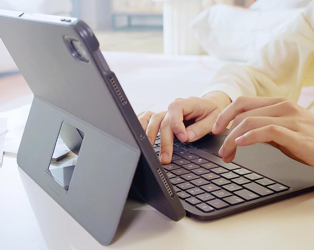 本製品はマグネットで簡単に着脱でき、キーボードを本体から離してワイヤレスタイピングが可能です。Apple Pencilの収納と2段階のスタンド角度調節で、作業や視聴にも快適に活用できます。