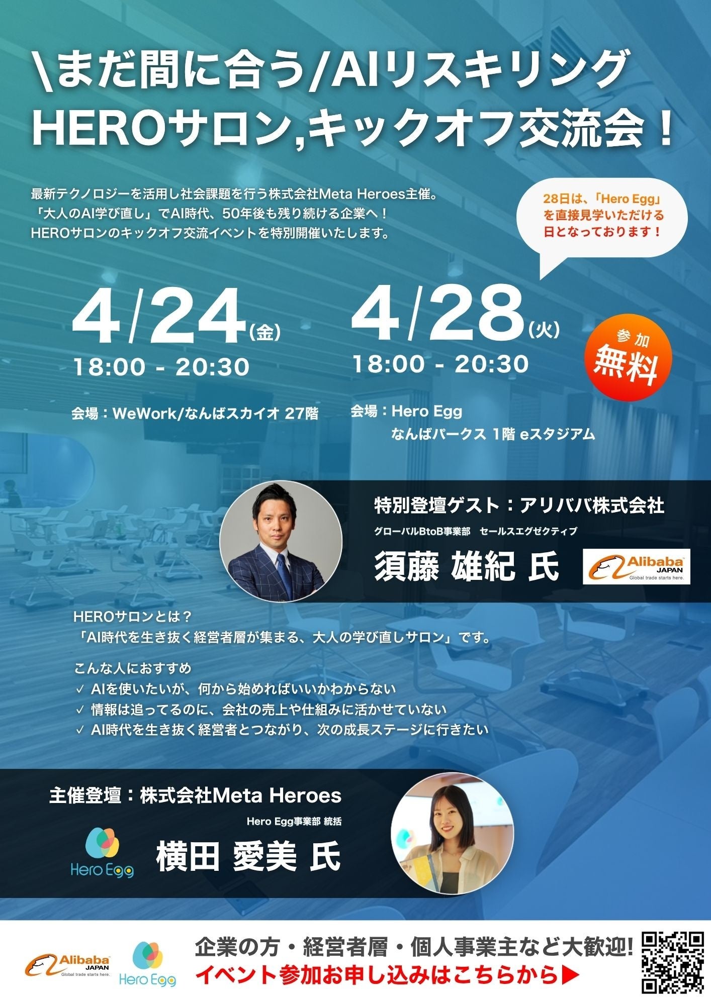 株式会社Meta Heroes(本社所在地:大阪府大阪市、代表取締役:松石和俊、以下「当社」)は、AI時代を勝ち抜く経営者・ビジネスリーダーのための学び直しコミュニティ「HEROサロン」の設立を記念し、アリババ株式会社を特別ゲストに迎えた「キックオフ交流会」を2026年4月24日(金)・28日(火)の2日間にわたり開催することをお知らせいたします。
