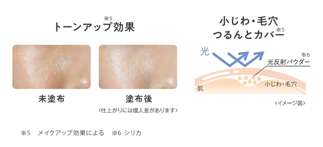 ※1 年齢に応じたお手入れ ※2 紫外線吸収剤不使用 ※3 保湿成分 ※4 加水分解コラーゲン末、コメ胚芽油(保湿) ※5 メイクアップ効果による ※6 シリカ