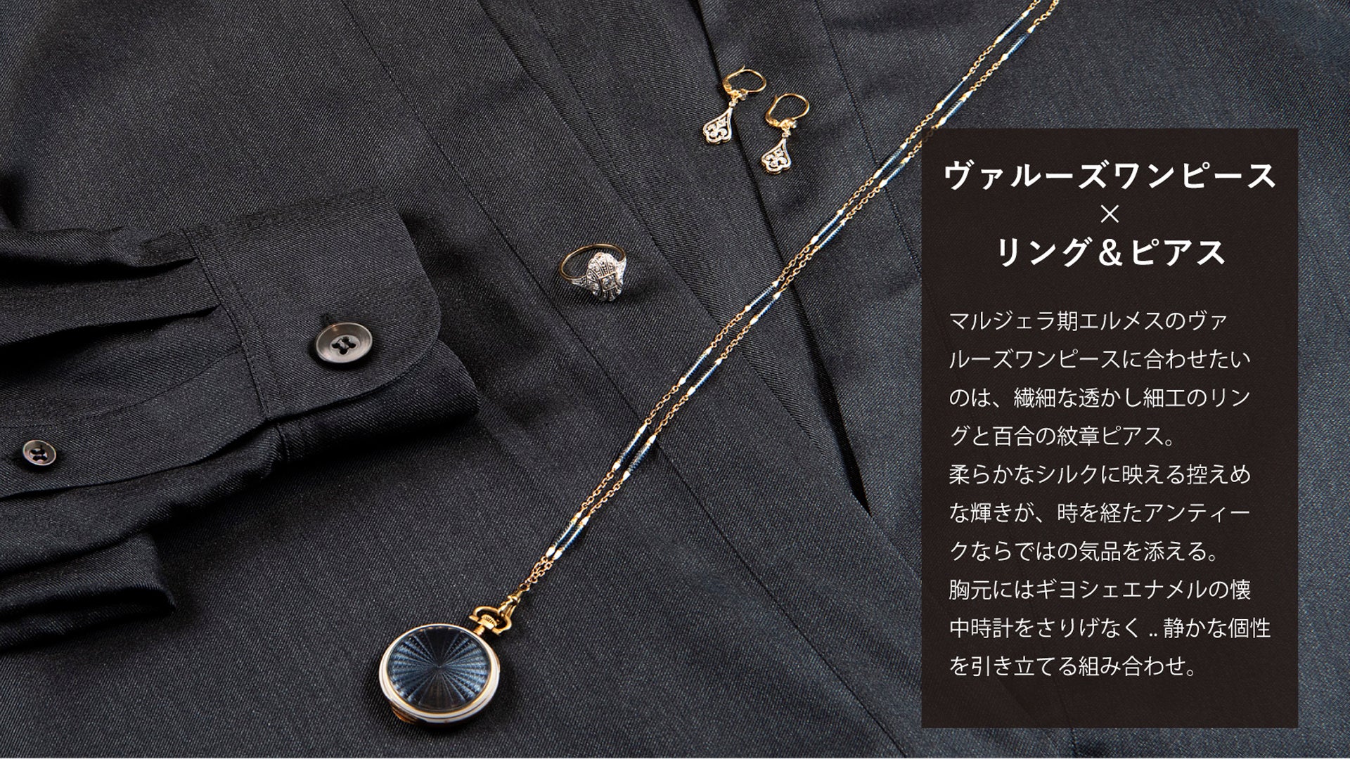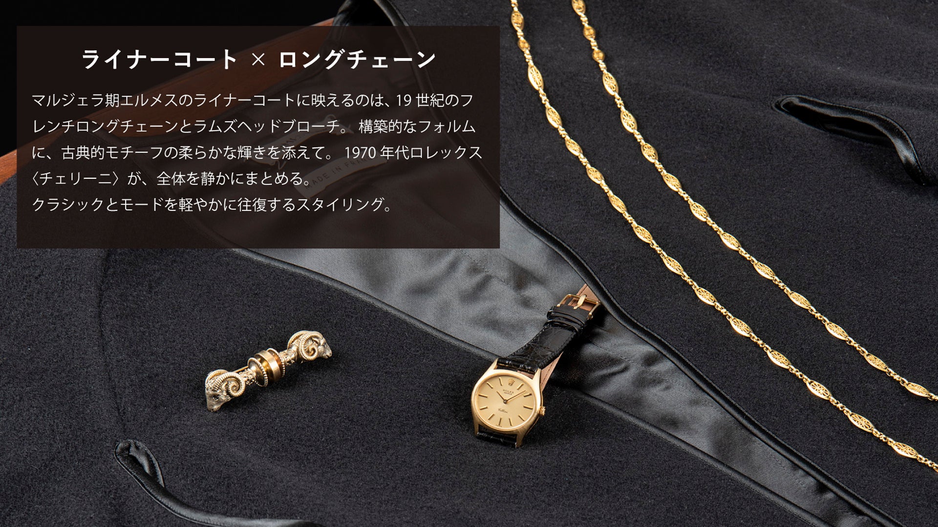 KOMEHYO SHIBUYAの特徴的な商品ラインアップのひとつである、マルジェラ期エルメスの洋服とシェルマンのメイン商材であるアンティークウォッチ・ジュエリーを組み合わせた、時代をまたぐコーディネート提案がみどころです。