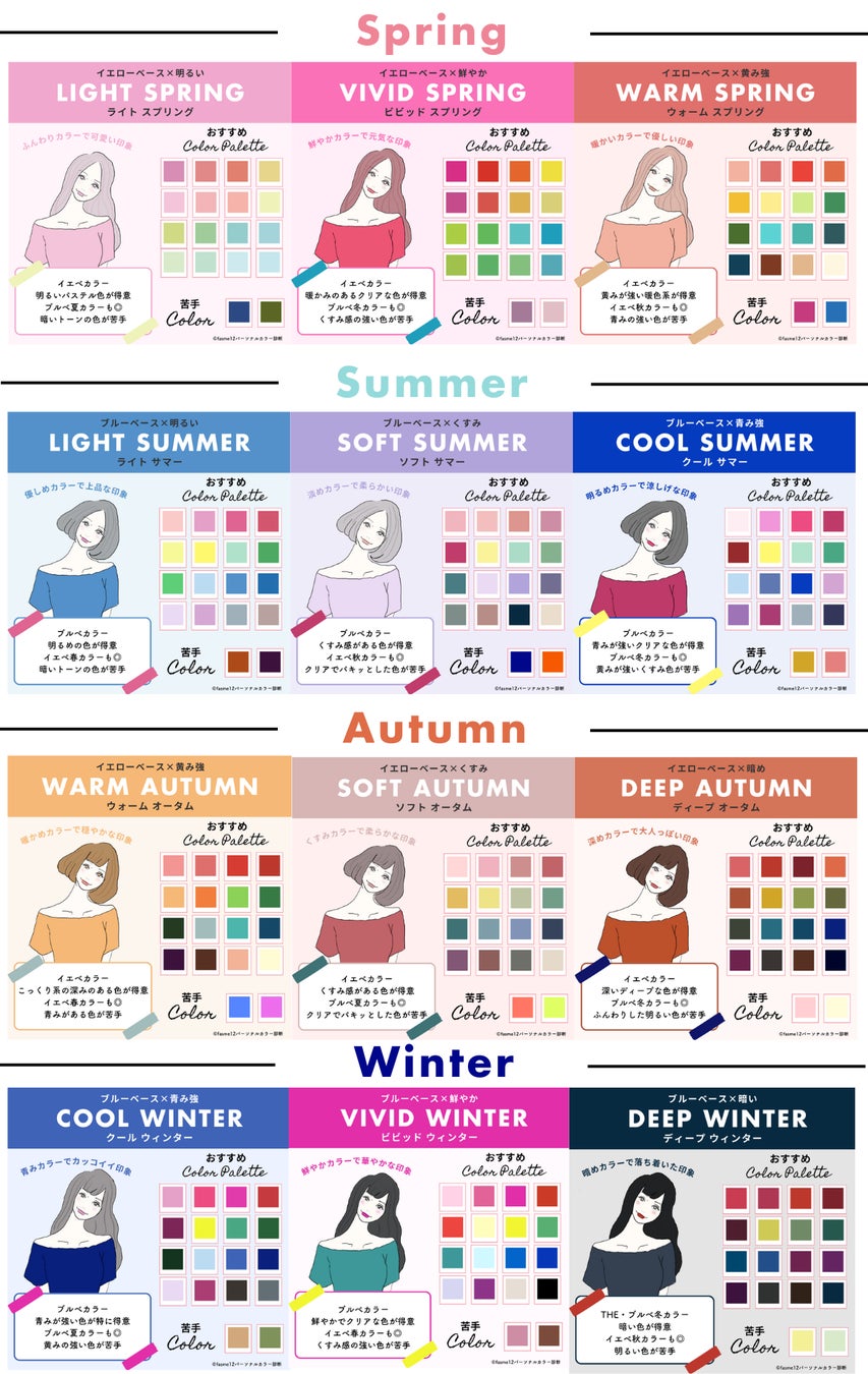 「fasme12パーソナルカラー診断」には12の診断結果があります。あなたのパーソナルカラーとともに、得意な色のカラーパレットと苦手な色を詳しく紹介します。