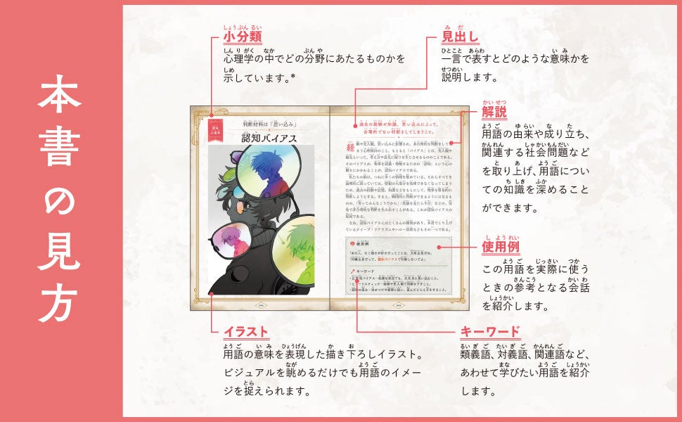「認知バイアス」「サイコパス」「ペルソナ」「インポスター症候群」……など、トレンドワードやさらっと使えたらかっこいい用語も多数収録していますので、10代から大人まで、まずは「心理学」のおいしいところをかじってみたい……という方におすすめの一冊です!