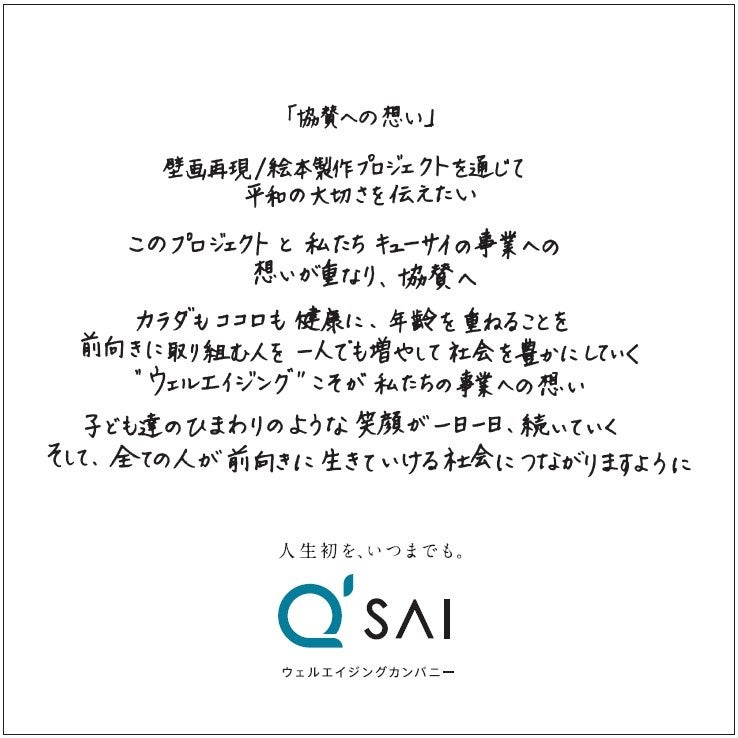 当社はカラダもココロも健やかで前向きに年齢を重ねる“ウェルエイジング”な世の中の実現を目指す企業として、活力ある豊かな地域社会の実現と次世代の子どもたちの成長を願い子育て環境の改善を目的とする本プロジェクトの主旨に賛同し、協賛する運びとなりました。
