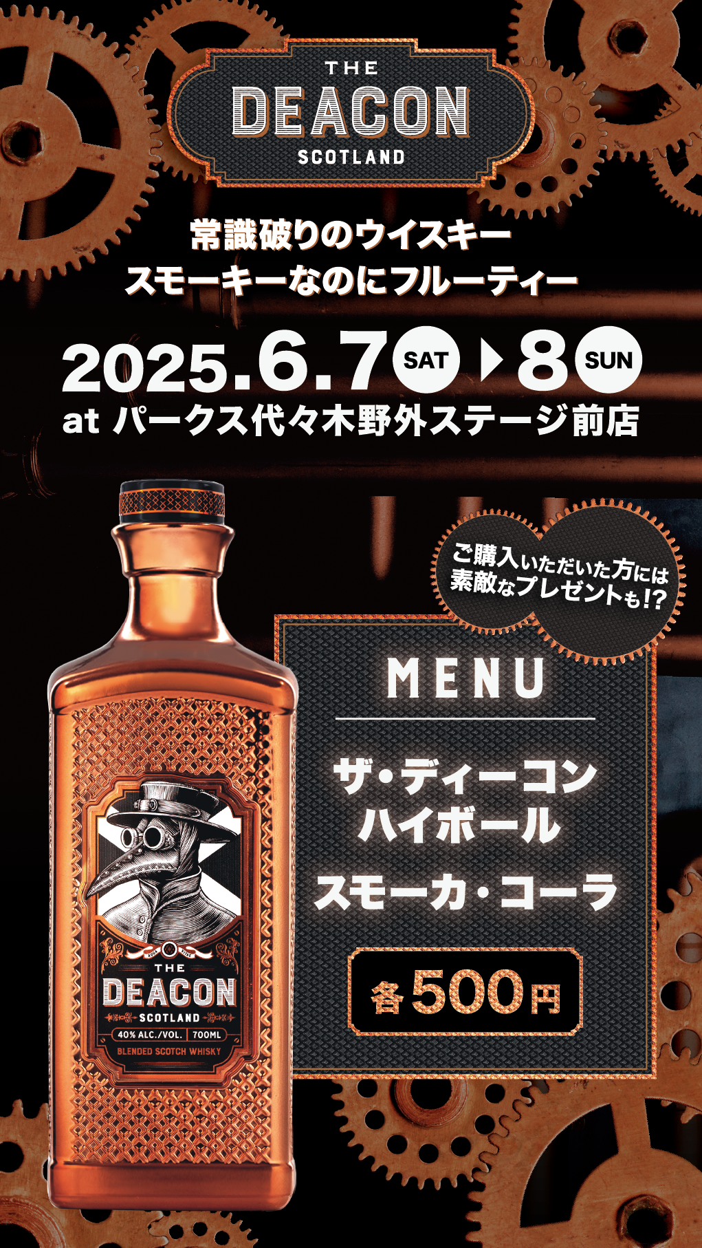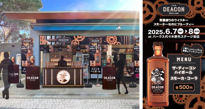 6月7日(土)・8日(日)の2日間、代々木公園内の売店「パークス代々木野外ステージ前店」で「ザ・ディーコン ポップアップバー」を展開します。ポップアップバーでは、 「ザ・ディーコン」 のハイボールやカクテルを1杯500円(税込)で販売します。