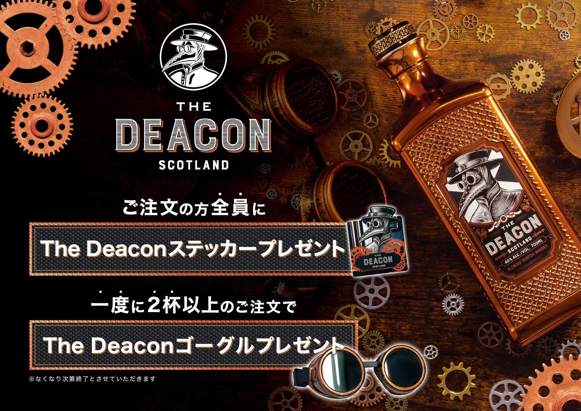 ご注文の方全員に、ザ・ディーコン オリジナルステッカー、1度に2杯以上ご注文の方にはザ・ディーコン ゴーグルをプレゼントさせていただきます。