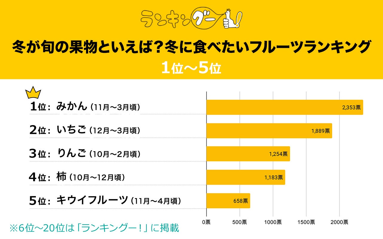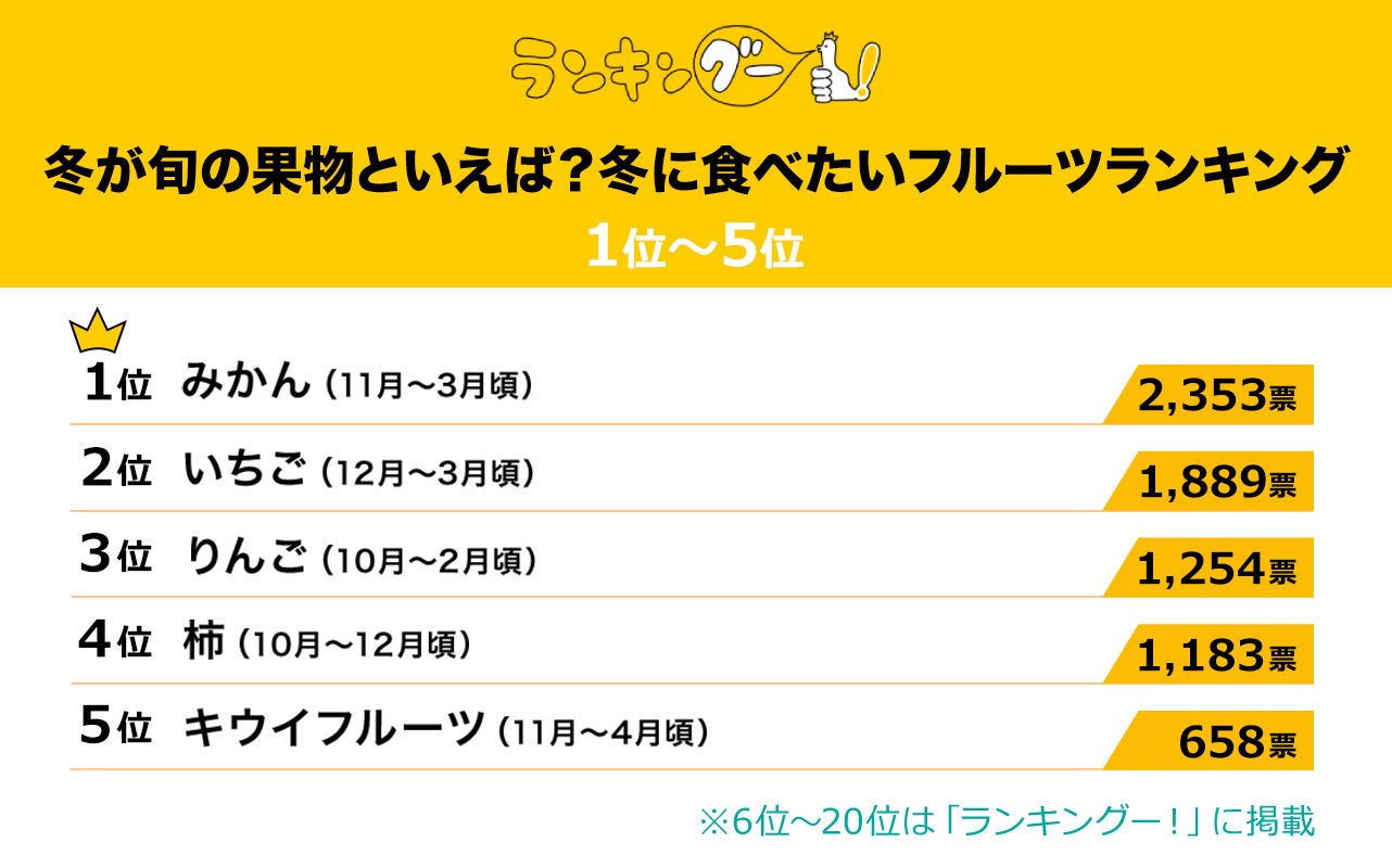 ランキングー!では冬に食べたいフルーツをピックアップし、ランキングを調査。全年代の男女(性別回答しないを含む)10,808名にアンケートを行い、TOP10を決定しました。ここではTOP5をご紹介します。