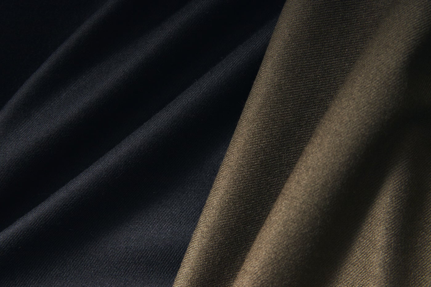 「これまでのアイテムもそうなのですが、ブリティッシュメイド オリジナルコレクションでは“上品さ”をひとつの柱にしています。 『マンチェスター』はルーツがワークなので、生地はウールを載せようと最初からイメージしていました。 いろいろと素材見本を吟味しつつ最終的にこちらを選んだのは、ドレープの美しさ。 『マンチェスター』は着心地が軽いシャツ仕立てなうえ、シルエットにはゆとりをもたせていますから、生地のドレープ性は非常に重要です。 硬すぎる生地だと野暮ったく見えてしまいますし、かといって薄手では貧相。 その点、こちらのサキソニーは理想的なドレープ感だったんです。 ちなみに織元は日本が誇る毛織物の名産地・尾州のミル。 やはり日本の生地はクオリティが高いですね」 (四方さん)