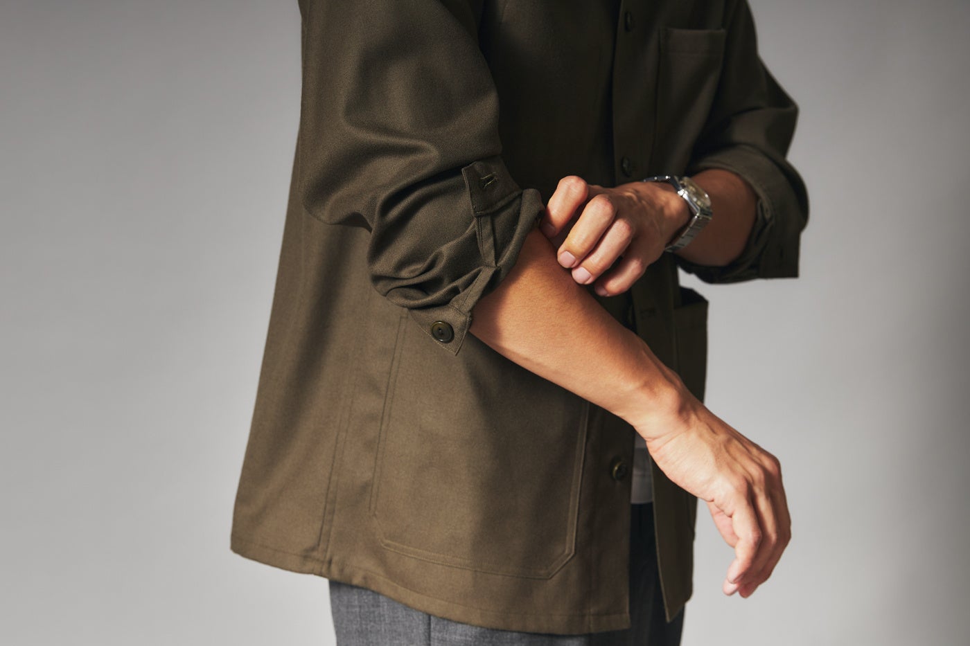 「ワークジャケットの袖はシンプルな筒状で、袖先が開閉できないものも多いのですが、それだと袖まくりなどのニュアンスがつけにくい。 ですので、細めのカフスをつけて開閉可能な袖口としました。 秋口でまだ寒さが厳しくない時季なら、写真のように袖をまくってもいいですね。 ちなみにボタンはフロントと同様にタグアヤシ製です」 (四方さん)