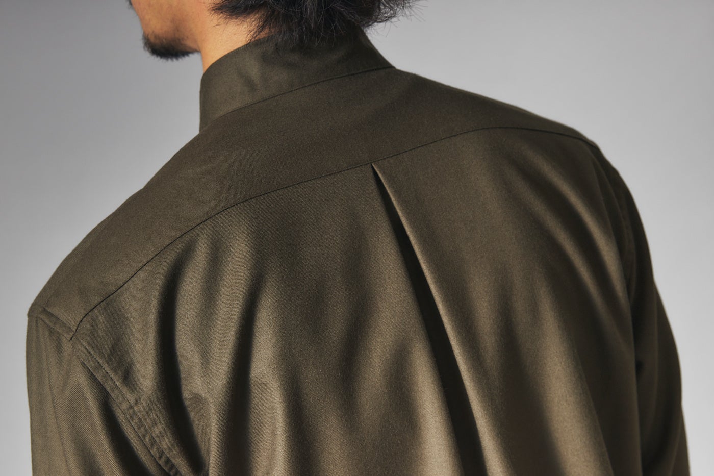 「コートをデザインしたとき、予想以上にインバーテッドプリーツが上手くできていたんです。 単にデザインのアクセントとなるだけではなく、シルエットの美しさが際立つんですよね。 その雰囲気をシャケットにも取り入れられないかと思い、今回採用してみました。 一般的なボックスプリーツよりも折り込む生地の量が多いので、ユニークな表情を演出できたと思います。 シャツ仕立てでインバーテッドプリーツを入れるには普通の製法だと難しいそうで、“乗っけヨーク”という特殊な作りを採用しました」 (四方さん)