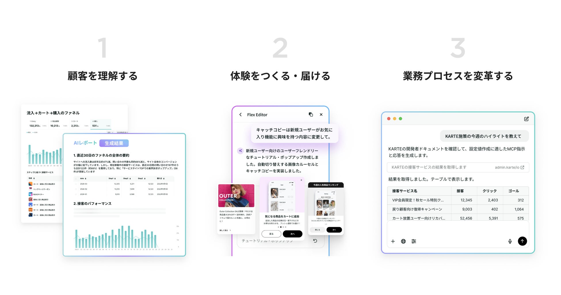 まずは、KARTEの特徴である顧客理解と顧客体験づくりの領域に加えて、KARTE独自のカスタマーデータの価値をあらゆる業務プロセスに活かすための機能拡充およびAIネイティブ化を推進していきます。そして、マーケティング領域にとどまらず、AIが前提となる企業環境の広範な領域で、企業の独自性の源泉となるカスタマーデータとそれに由来する「人」の創造性をシームレスに組み込み、企業活動全体で顧客を魅了する独自価値の創造を追求できる環境を提供していきます。
