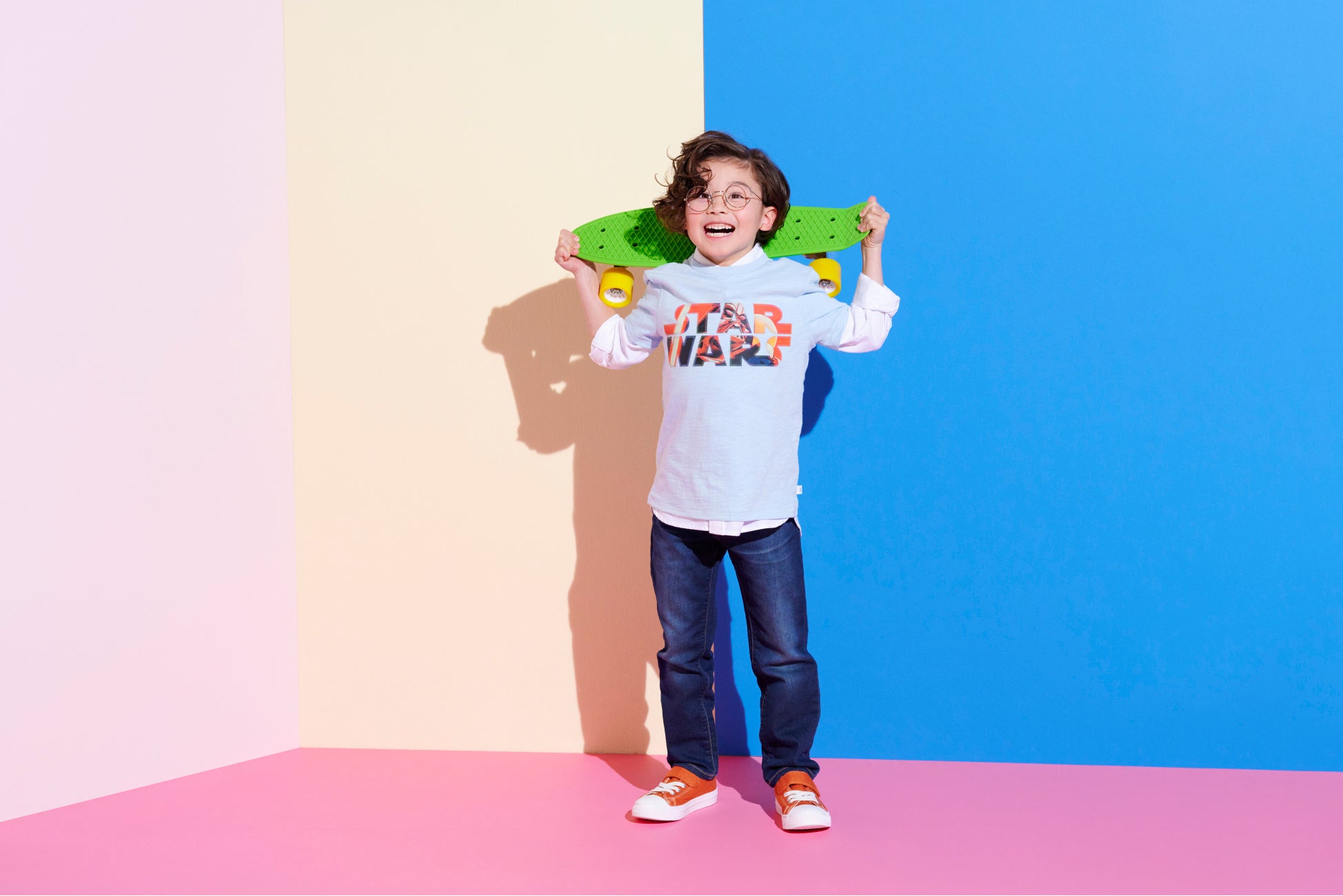 キャンペーンビジュアルでは、子どもたちの感性や好奇心を表現するハッシュタグを共に展開。春の訪れを感じさせる花柄や爽やかなストライプのワンピース「#ひらひらすると踊りだす」「#春風で空まで飛べそう」、アクティブなGapロゴTシャツとスウェットショートパンツ「#こんなに高く飛べるよ!」、スターウォーズとのコラボレーションTシャツとデニム「#今日は何に挑戦しようかな」など、オプティミスティックな雰囲気とともにスタイリッシュなコーディネートを提案しています。