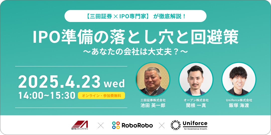 IPO準備中の企業に対して、「RoboRoboコンプライアンスチェック」を通じて経営・上場リスク排除の支援を行っているオープンと、IPO主幹事証券として対象企業の指導等を行う三田証券、ITとコンサルの両軸から対象企業をサポートする「IPO準備クラウド」を提供するUniforceが、それぞれの専門的な視点から上場準備の過程で陥りがちなリスクとその回避策を解説し、実践的な知識を提供します。