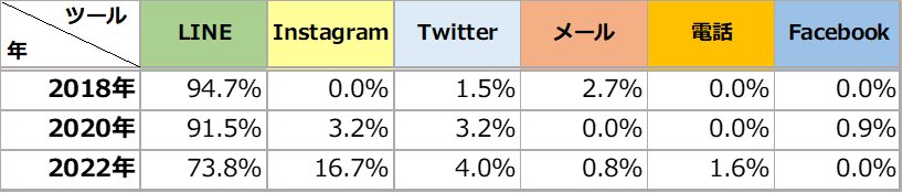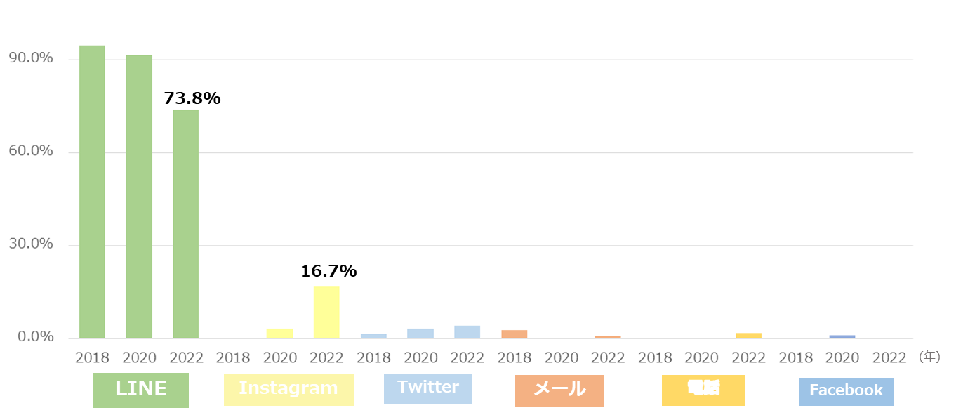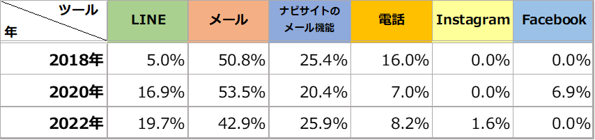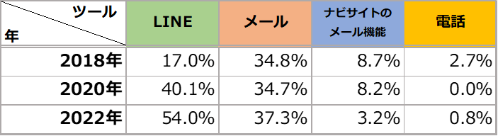 ● 「LINE」は2020年から13.9ポイント増加し、2年連続1位に。「ナビサイトのメール機能」は年々減少傾向になっています。
