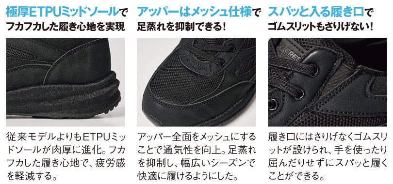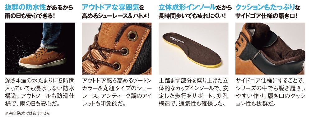 手を使わずに、立ったままスパッと履ける「スパットシューズ」は、発売当初から幅広い世代にご好評いただいております。今回誌面で紹介しているのは2タイプ。スペックもビジュアルもアウトドアな雰囲気を醸し出すミドル丈ブーツCC-60863は、くるぶしまで覆うミドル丈でありながら、スパッと履ける独自構造を実現しました。よりカジュアルに使いやすいローカットモデルCC-60862も展開します。また、メッシュタウンカジュアルCC-60770には、オールブラック、カーキ、ブラウンの3色が新登場。ソールのスペックもバージョンアップ、さらにアッパー全体のメッシュ素材など、快適さも充実し、オンにもオフにも活躍してくれます。