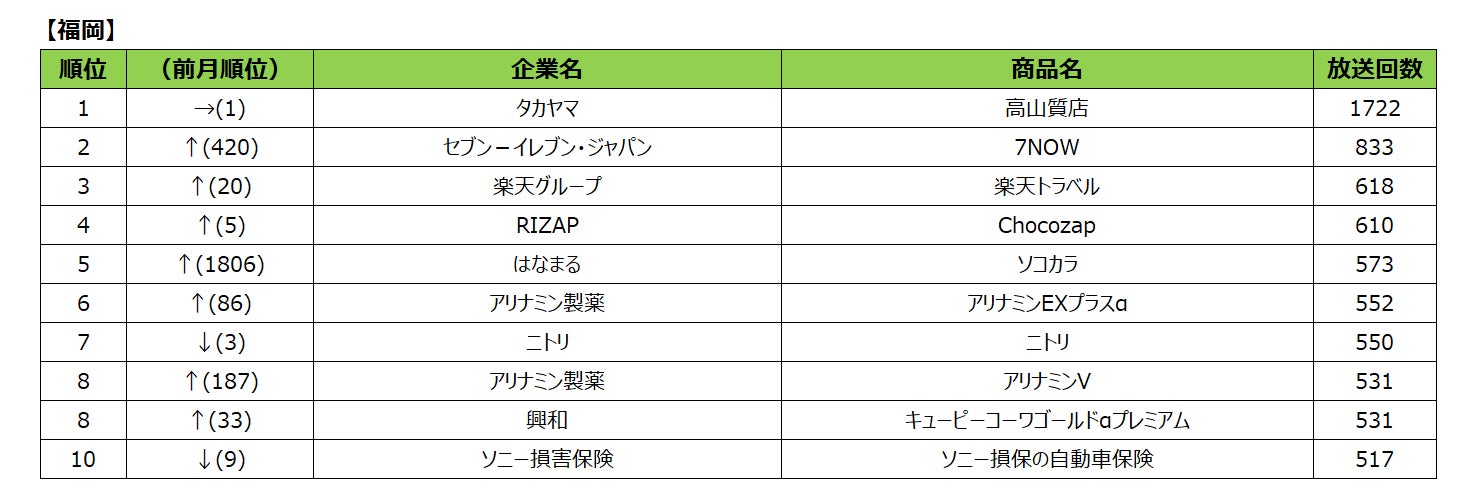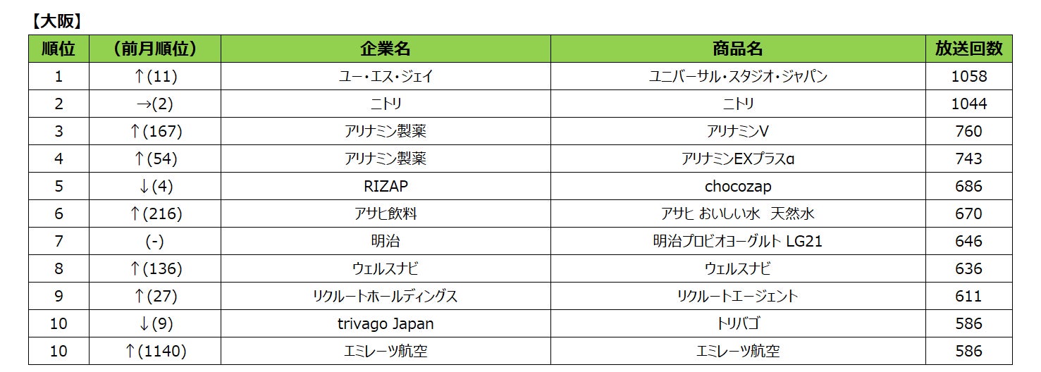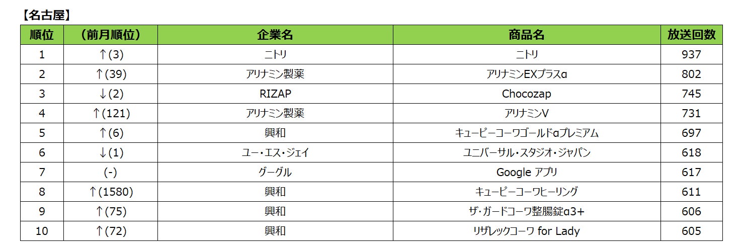 地域別ランキングは各地域の上位が異なる混戦となりました。東京地区1位は、資産運用アプリのウェルスナビ「ウェルスナビ」、大阪地区1位はユー・エス・ジェイ「ユニバーサル・スタジオ・ジャパン」、名古屋地区1位はニトリ「ニトリ」、福岡地区1位はタカヤマ「高山質店」、札幌地区1位はリクルートホールディングス「スーモカウンター」と地域ごとの特色が見られる結果となりました。