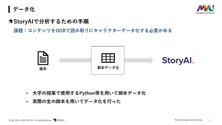 今回の約4か月間の長期インターンシップには、武蔵野大学データサイエンス学部の3名の学生が参加しました。StoryAIは、テキストおよび画像から機械学習でストーリーを感情分析するサービスですが、インターンシップでは、実際に本物の脚本を用い、StoryAIで分析するための前処理となるデータ化の技術検証、新たな学習モデルの検討やプログラム構築、およびStoryAIの新たな分析機能の検討・開発に取り組みました。