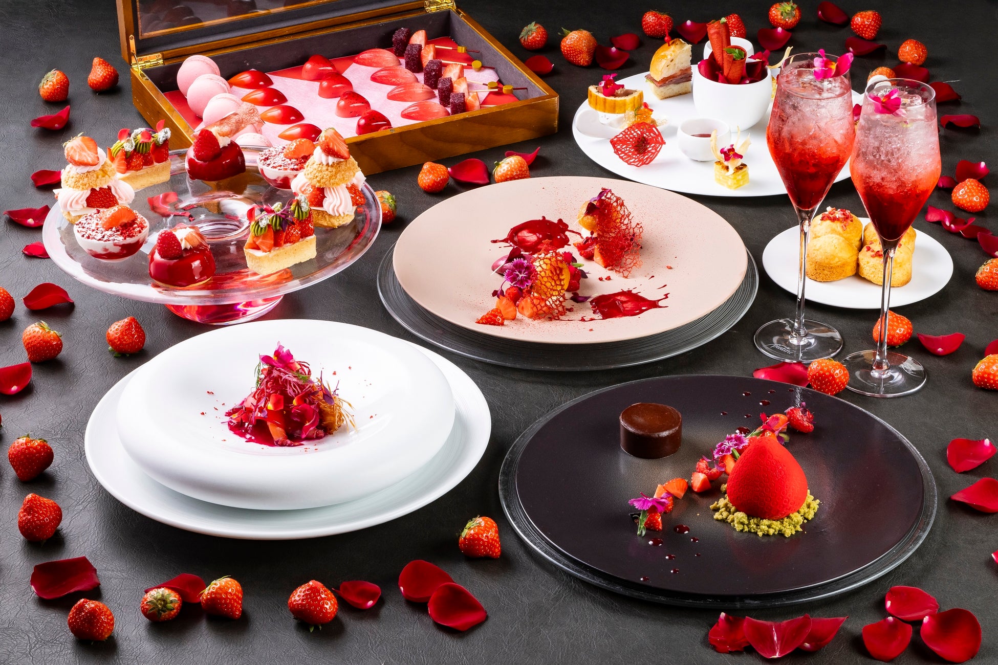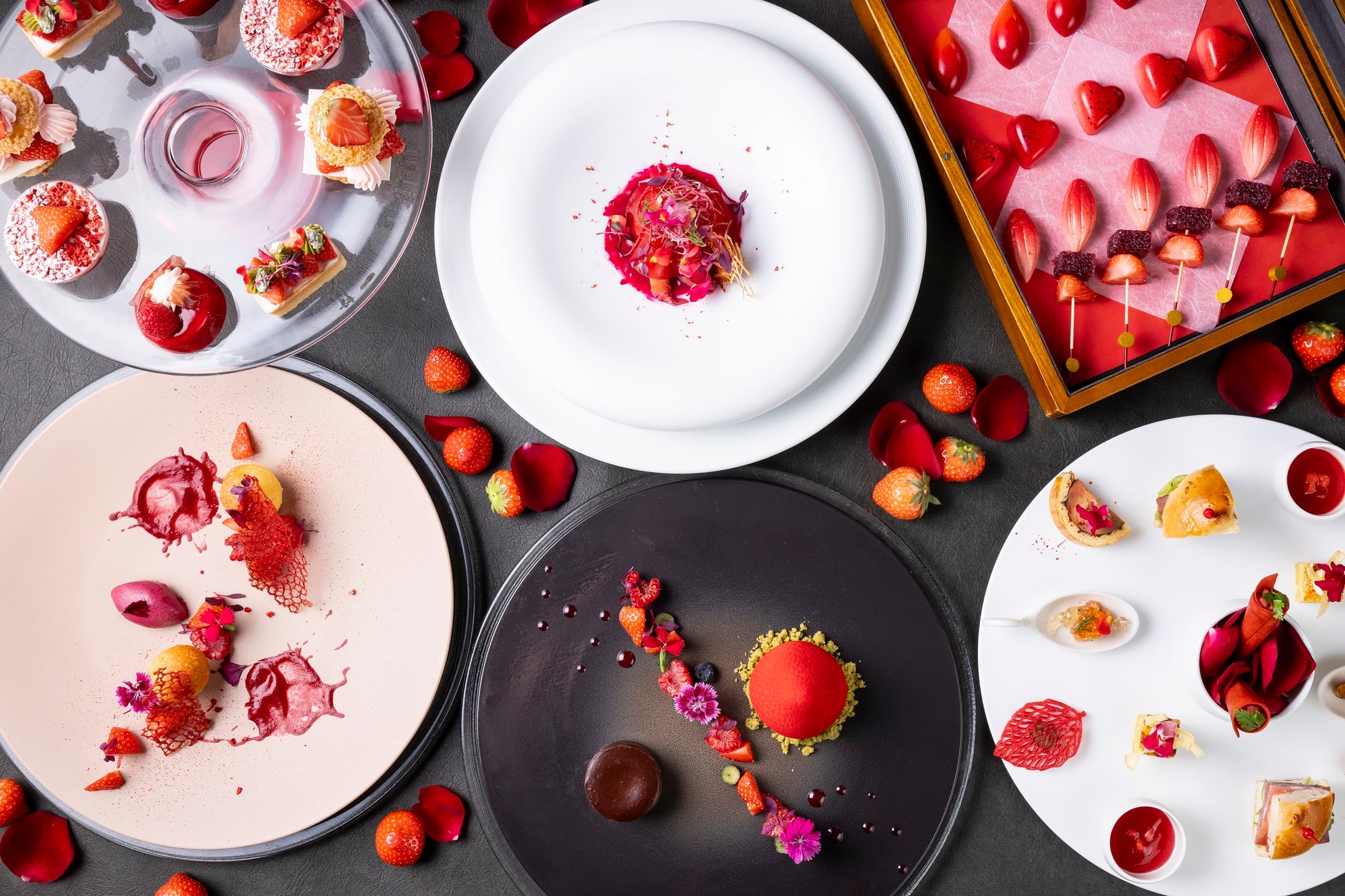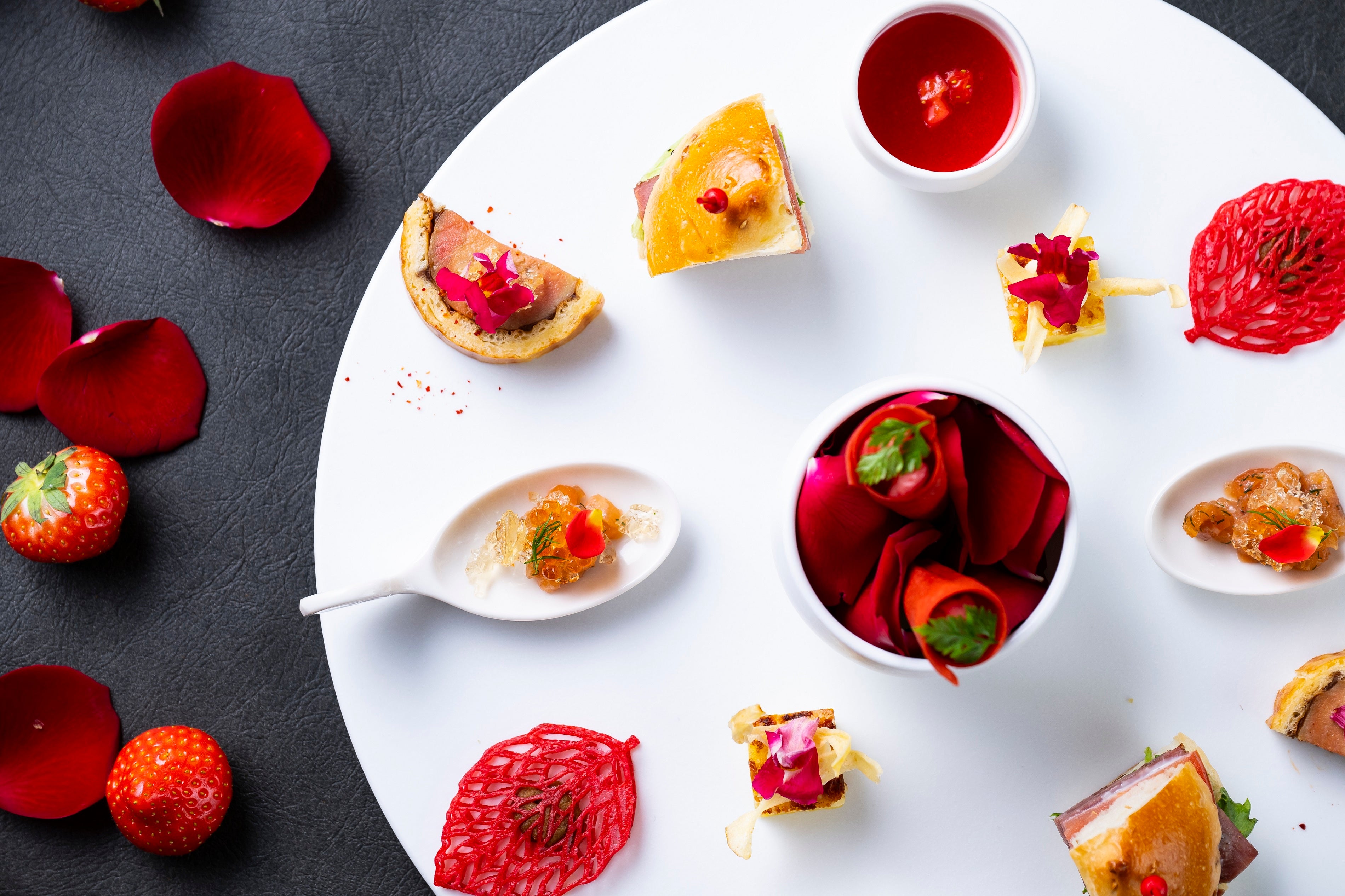 鮮やかで華やかな真紅のオードブルプレートは、天使の海老とズワイ蟹をマリネにして、薔薇のエキスを抽出したジュレとビーツのソースのマリアージュをお楽しみいただけます。いちごをまるごと使い爽やかな味わいのいちごの冷製スープやフォアグラとブリオッシュなど7種のセイボリー、いちごのティラミスやタルトなど4種のスイーツを取り揃えました。