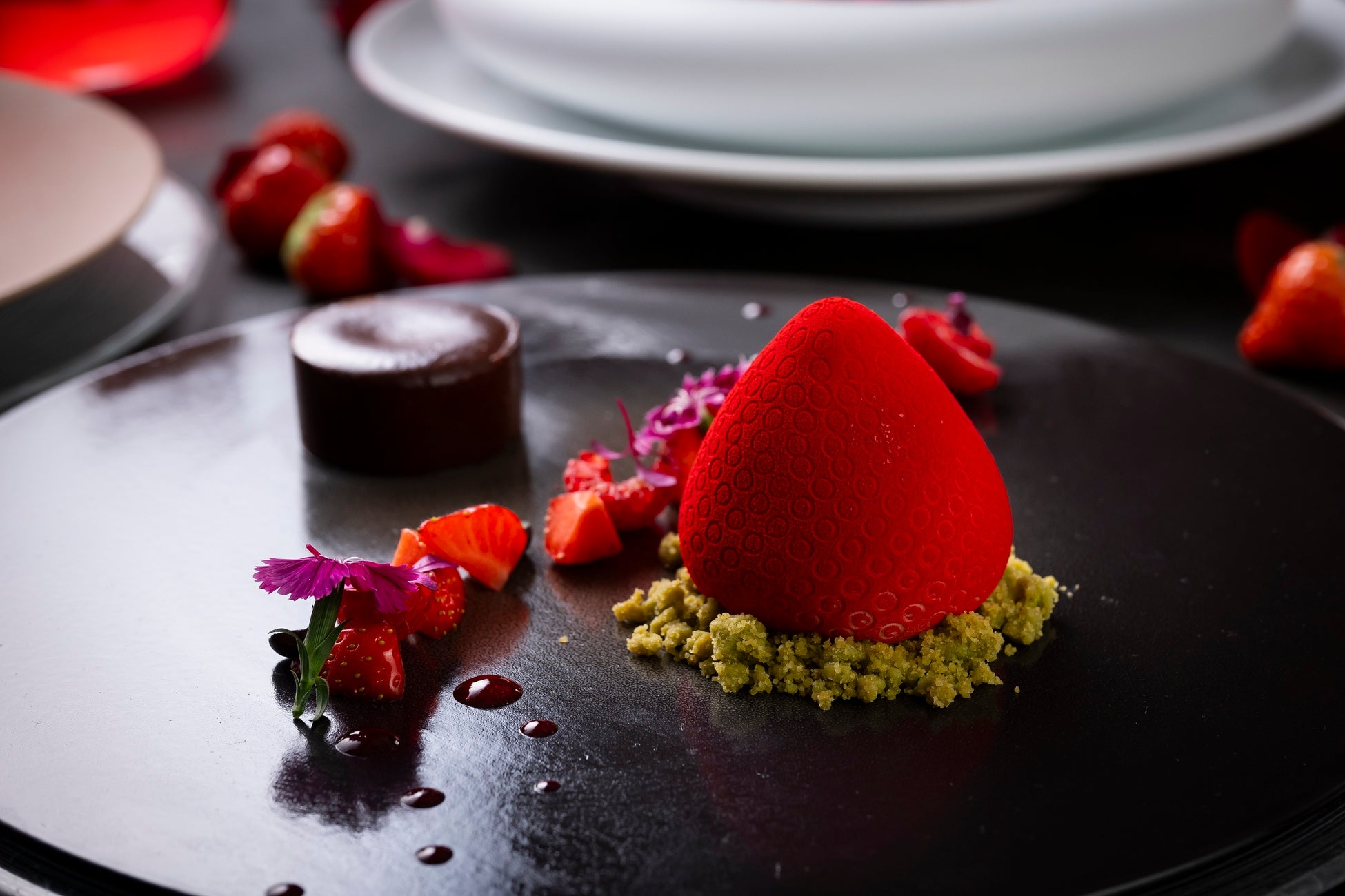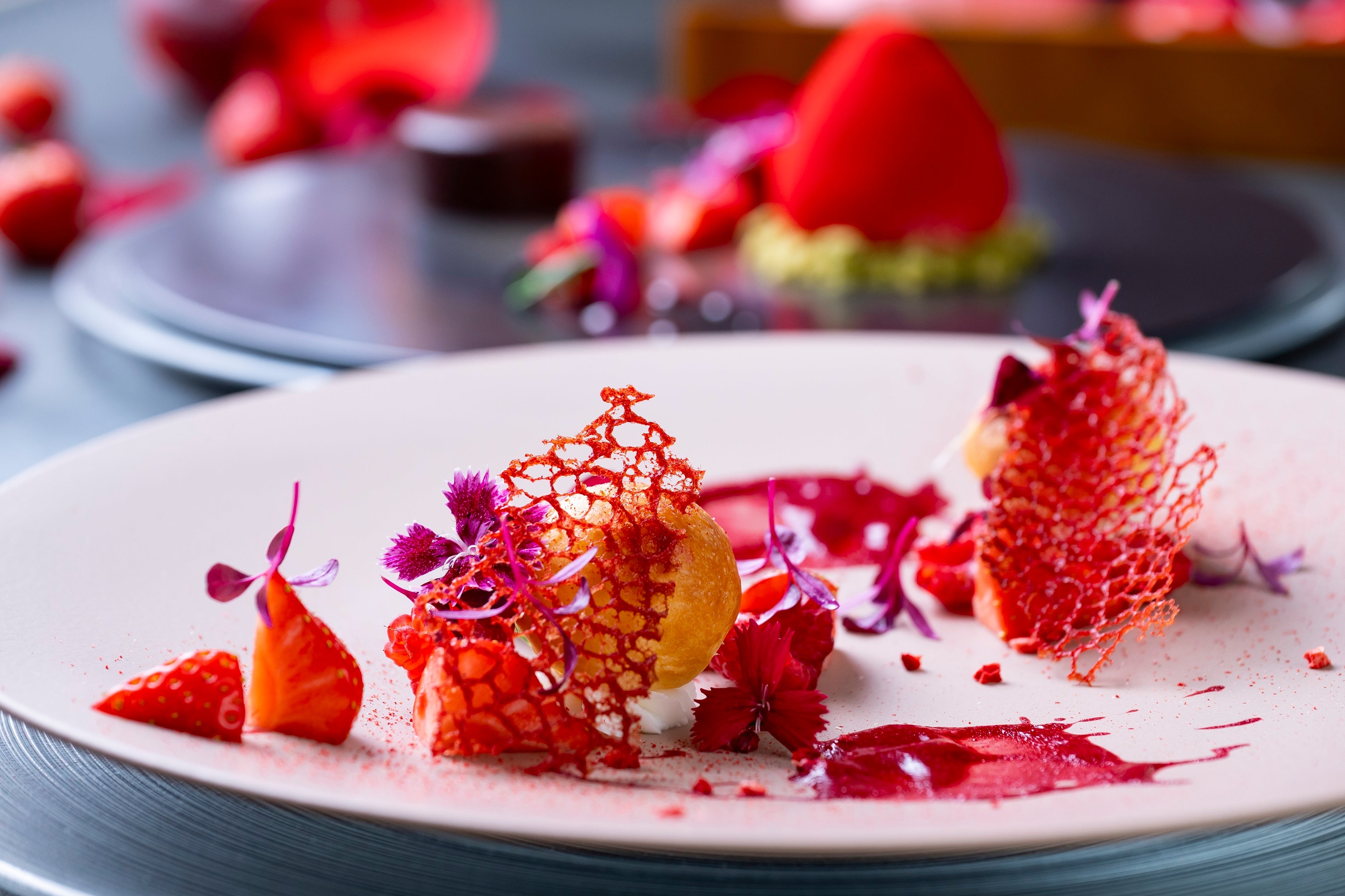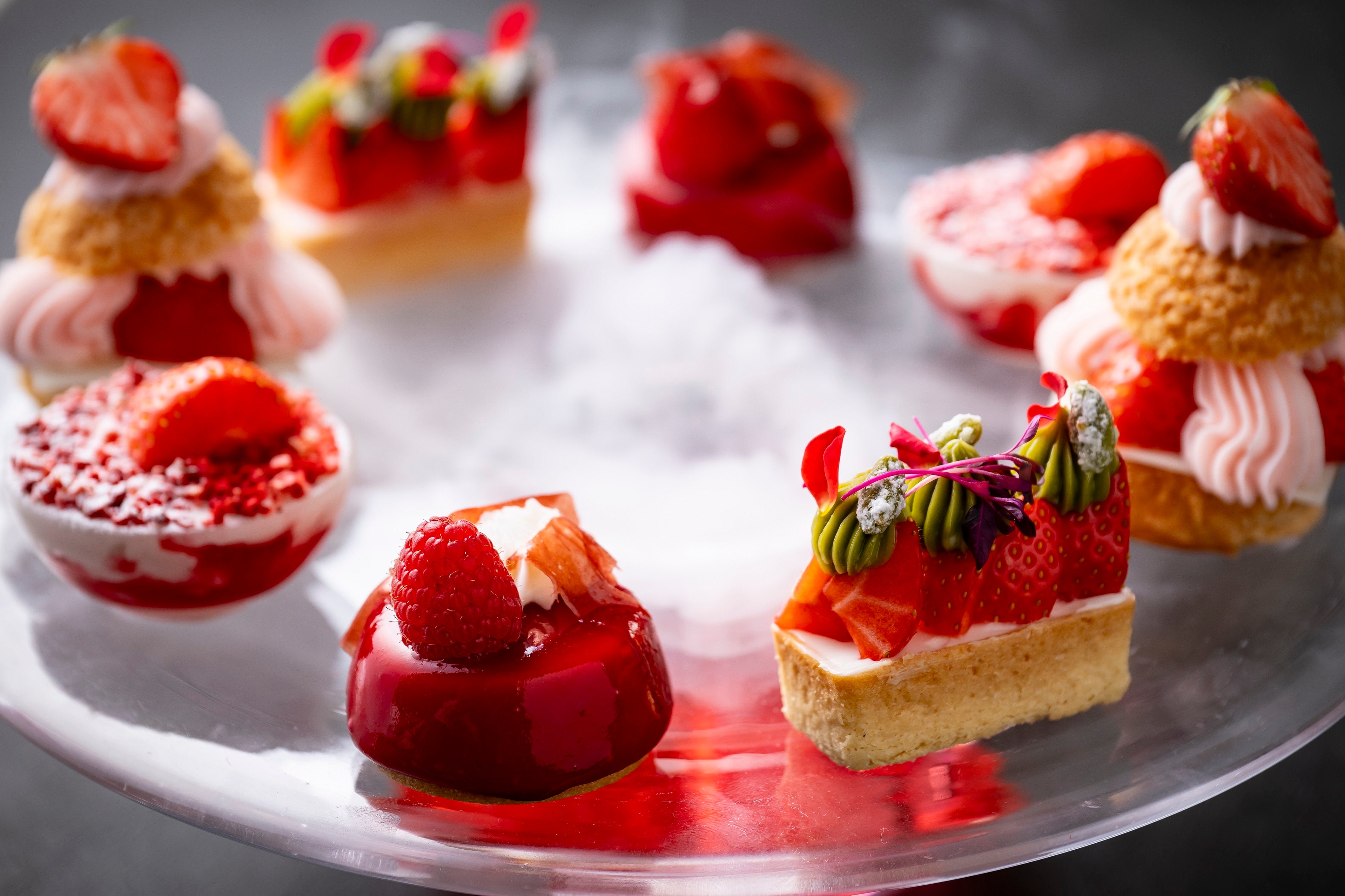 鮮やかで華やかな真紅のオードブルプレートは、天使の海老とズワイ蟹をマリネにして、薔薇のエキスを抽出したジュレとビーツのソースのマリアージュをお楽しみいただけます。いちごをまるごと使い爽やかな味わいのいちごの冷製スープやフォアグラとブリオッシュなど7種のセイボリー、いちごのティラミスやタルトなど4種のスイーツを取り揃えました。