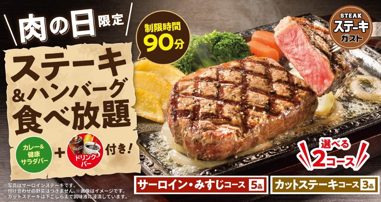 | < ステーキガストの「肉(29)の日」も、同時開催予定! > 2月9日(木)/ 3月29日(水)は、選べる2コースの「ステーキ&ハンバーグ食べ放題」 |