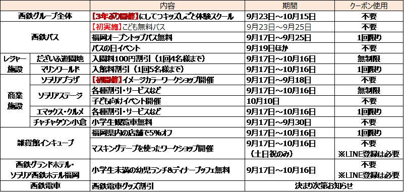 各種割引・サービスには、「にしてつキッズチャンネル」LINE公式アカウント内で配布されるクーポンを必要とする場合がございます。詳細は西鉄グループホームページ内「にしてつキッズフェア」特設ページにてご確認ください。