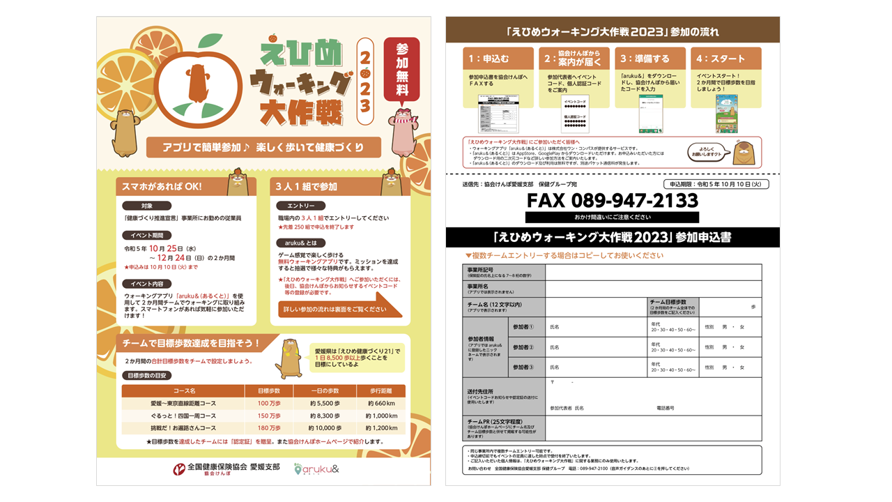 協会けんぽ 愛媛支部のウォーキングイベント「えひめウォーキング大作戦2023」にウォーキングアプリ「aruku&」が活用されます