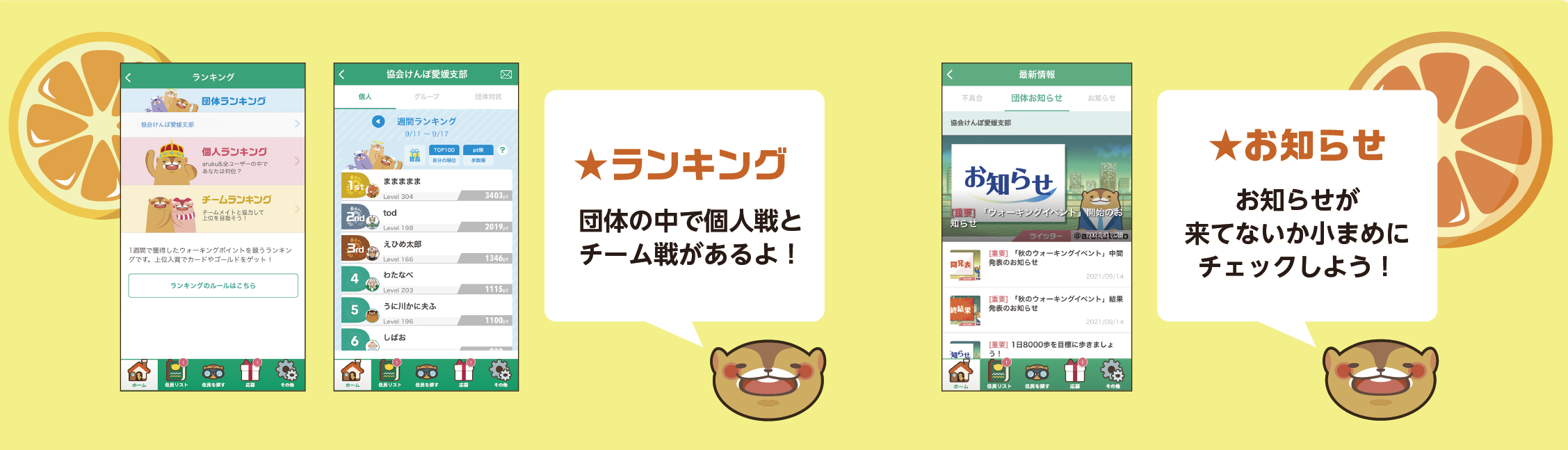 イベント終了後は、協会けんぽ愛媛支部WEBサイト内で、各チームのランキングと目標歩数の達成状況および達成率を掲示いたします。