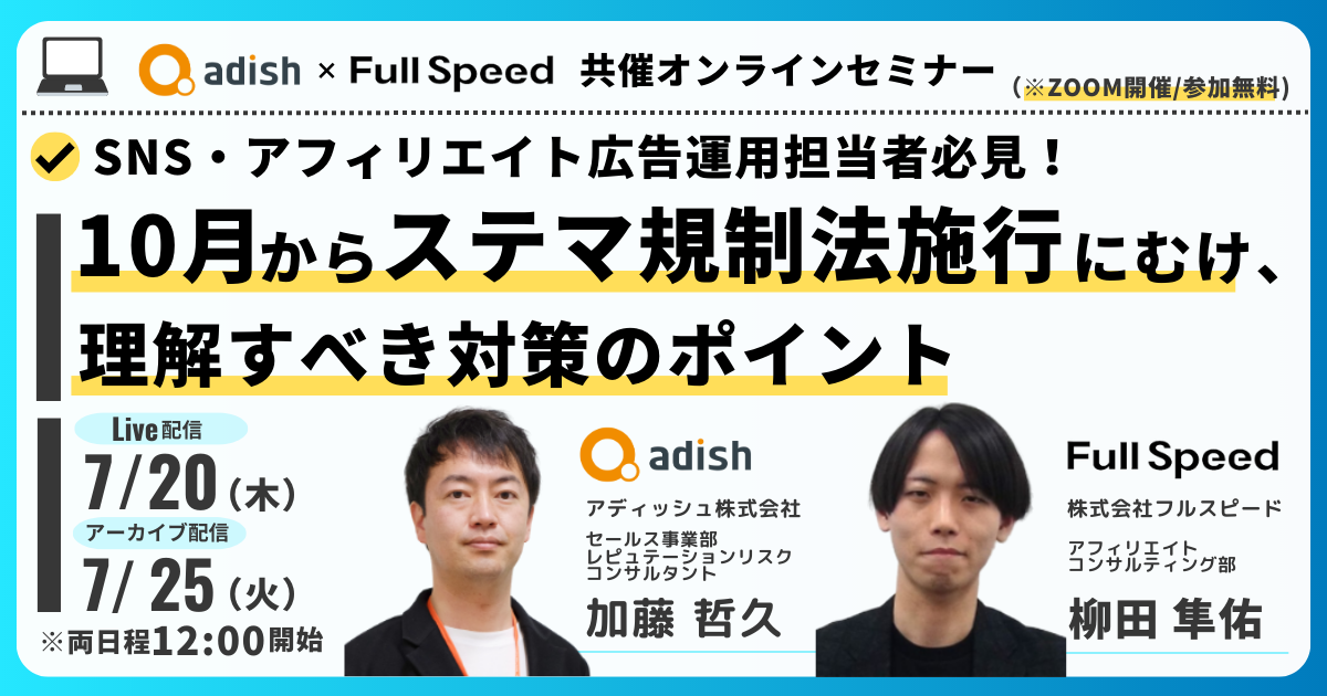 【オンラインセミナー】フルスピード×アディッシュ共催SNS・アフィリエイト広告担当者必見!10月からステマ規制法施行にむけ、理解すべき対策のポイント