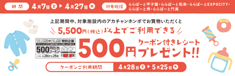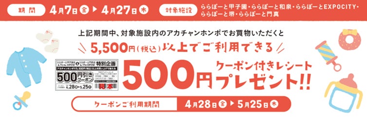 4月7日(金)~4月27日(木)の期間中、「ららぽーと門真」グランドオープンを記念して、対象施設内(ららぽーと門真・ららぽーと甲子園・ららぽーと和泉・ららぽーとEXPOCITY・ららぽーと堺)のアカチャンホンポでお買上げいただいた方に5,500円(税込)以上でご利用いただける500円引きクーポンをプレゼントいたします。
