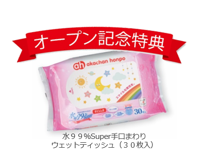 4月17日(月)~4月23日(日)まで期間限定セールを開催します。ららぽーと門真店だけの特別価格の商品を多数ご用意して、皆さまのご来店をお待ちしております。オープン記念特典として、セール期間中お買上げいただいた方に「水99%Super 手口まわりウェットティッシュ(30枚入)」をプレゼントします。(各日先着200名様限定※1家族様1点限り)さらに、4月17日(月)~4月20日(木)の4日間は全品ポイント10倍を実施します。