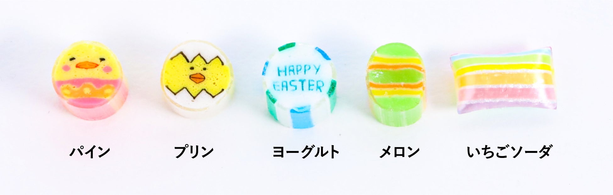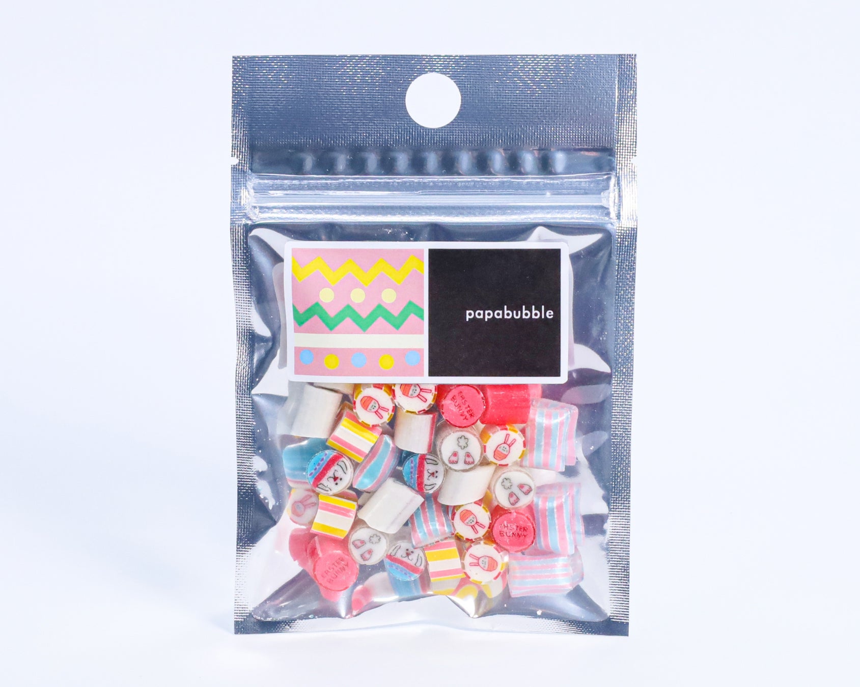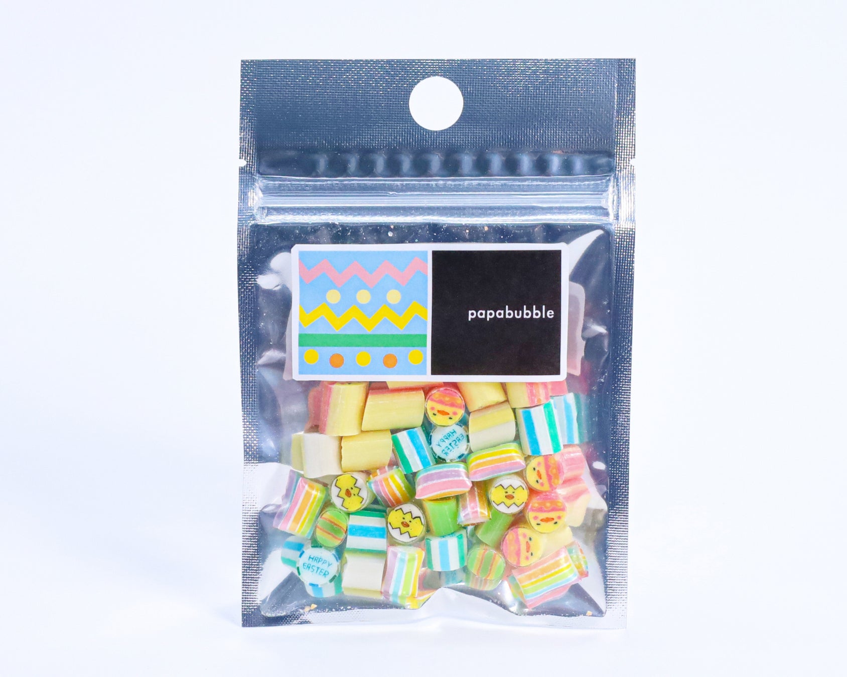 たまごの殻をかぶった愛らしいひよこや「HAPPY EASTER」の文字が入った、春を感じさせるパステルカラーのキャンディを詰め込んだ限定ミックスです。ヨーグルトやパインなど爽やかな酸味のフレーバーに加え、パパブブレでは珍しい、こっくり甘いプリンフレーバーを揃えました。パパブブレにとって初挑戦となった楕円形のキャンディは、難易度の高い形状を職人の手で卵形に再現した、イースターらしさ満載の商品です。