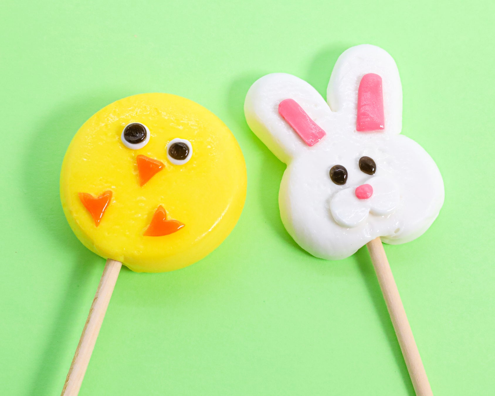 一つ一つのパーツを手作業で製造し、うさぎの口周りのモフモフ感やひよこの小さな足など、配置にも形状にもこだわりました。イースターの到来に心が躍る、パーティーでの写真撮影にもピッタリなロリポップです。