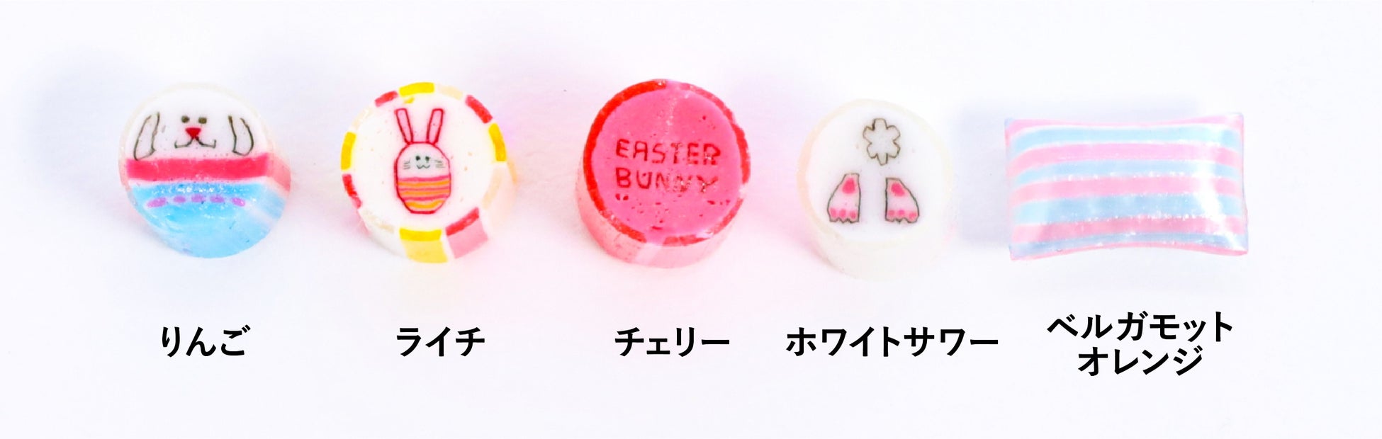 ぴょんぴょんと楽しそうな様子を表現した“おしり”柄や、イースターエッグに変身したうさぎ柄など、元気いっぱいのウサギを表現したミックスキャンディです。リンゴ・チェリーのジューシーなフレーバーに加え、ホワイトサワー・ライチなどの限定フレーバーが入っています。「ハッピーイースターミックス」「イースターバニーミックス」のどちらも楽しみたい方に、個包装タイプもご用意しています。