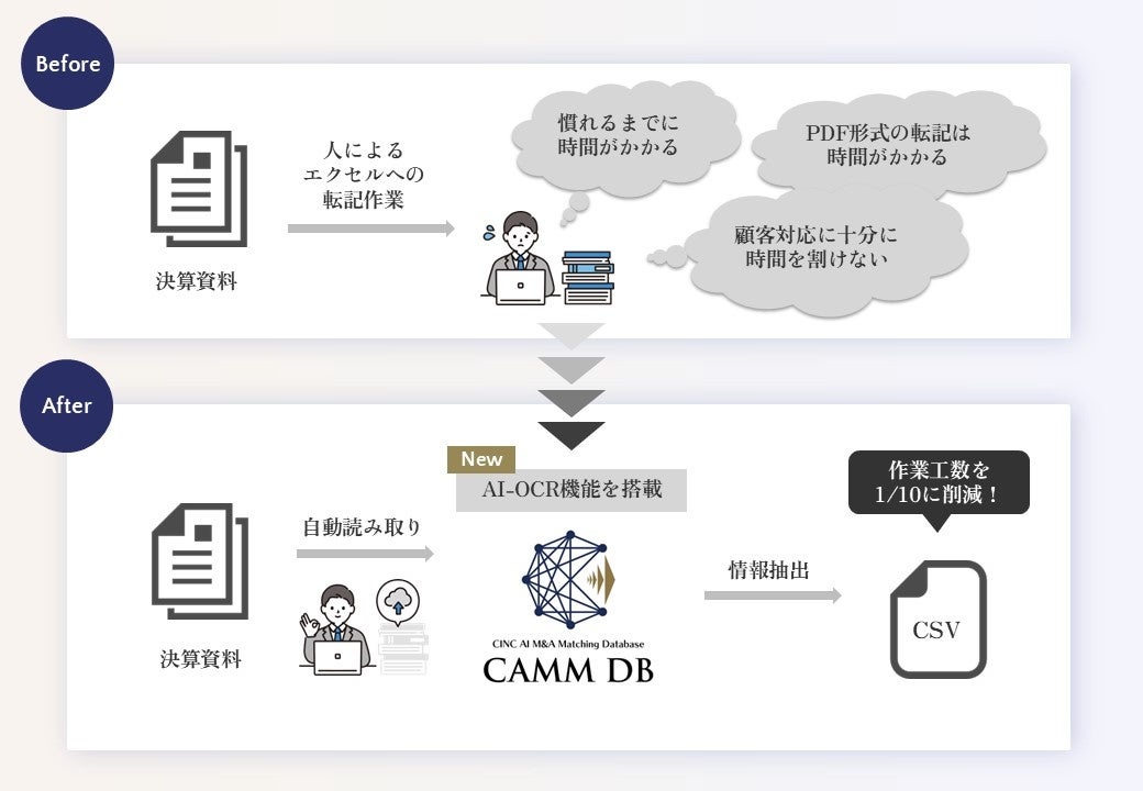 株式会社CINC(本社:東京都港区、代表取締役:石松友典、以下CINC)の子会社である株式会社CINC Capital(所在地:東京都港区、取締役 執行役員社長:阿部泰士、以下CINC Capital)は、CINCの持つデータ収集技術やデータ分析の知見を活かしたM&A仲介事業を実現すべく、事業開始当初よりシステムの開発に注力しています。今回は、生成AIを活用した社内用M&A仲介マッチングシステム「CAMM DB(キャムディービー)」に、決算書をはじめとする各種ドキュメントの自動読み取りを行うAI-OCR機能を搭載し、利用を開始しました。