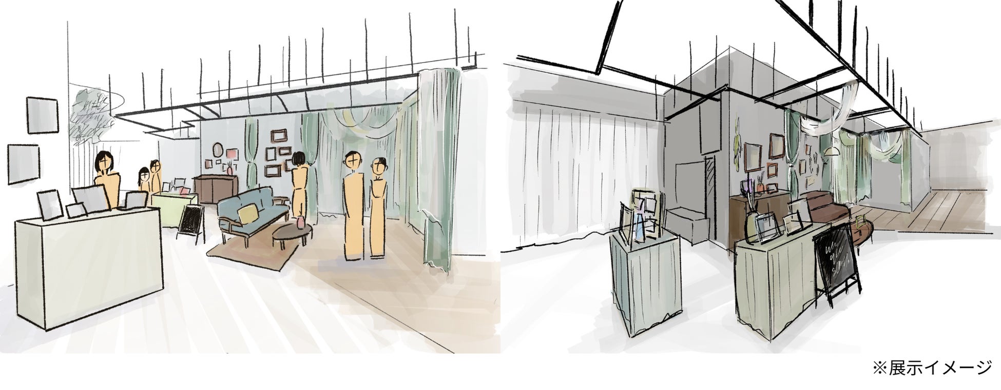 株式会社mederu(https://mederu-inc.jp/)によるアートディレクションで、結婚写真を撮影したカップルや撮影企業から集まった数十点の結婚写真を、自宅のような空間でご覧いただけます。館内は撮影可能です。