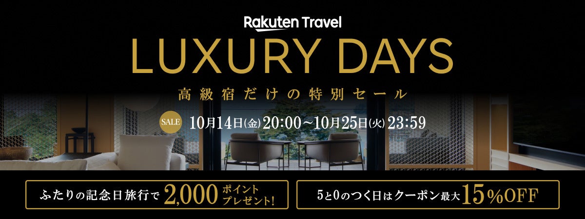 旅行予約サービス「楽天トラベル」( https://travel.rakuten.co.jp/ )は、厳選した国内の高級ホテルや旅館(注1)をお得に予約できるキャンペーン「LUXURY DAYS」を2022年10月14日(金)20:00~2022年10月25日(火)23:59の期間に開催します。本キャンペーンでは、1,200以上の宿泊施設を対象とした期間限定の特別プランや、宿泊予約時に利用できるクーポンを多数提供します。更に、大人2名の宿泊者に「楽天ポイント」を2,000ポイントを還元する、「ふたりの記念日旅行で2,000ポイント」キャンペーンを同期間に開催します。