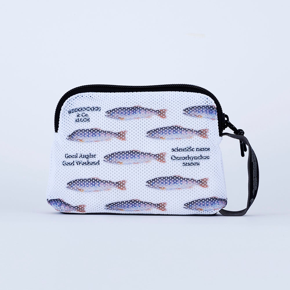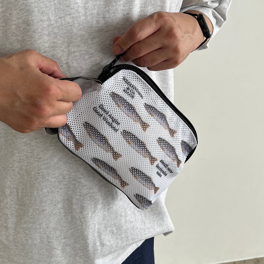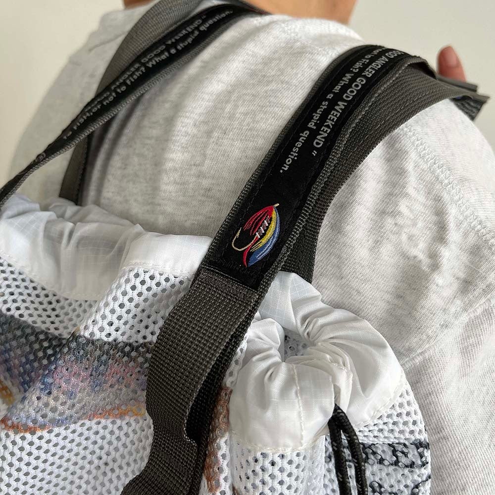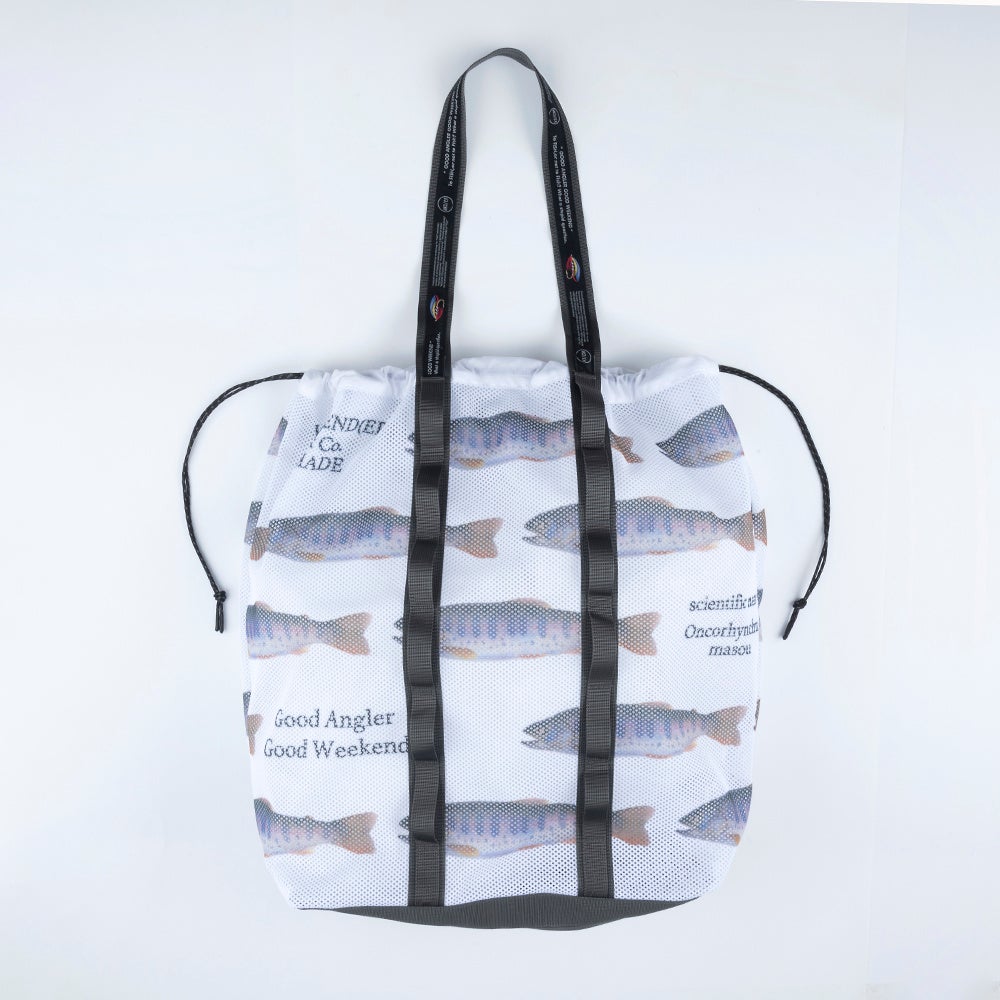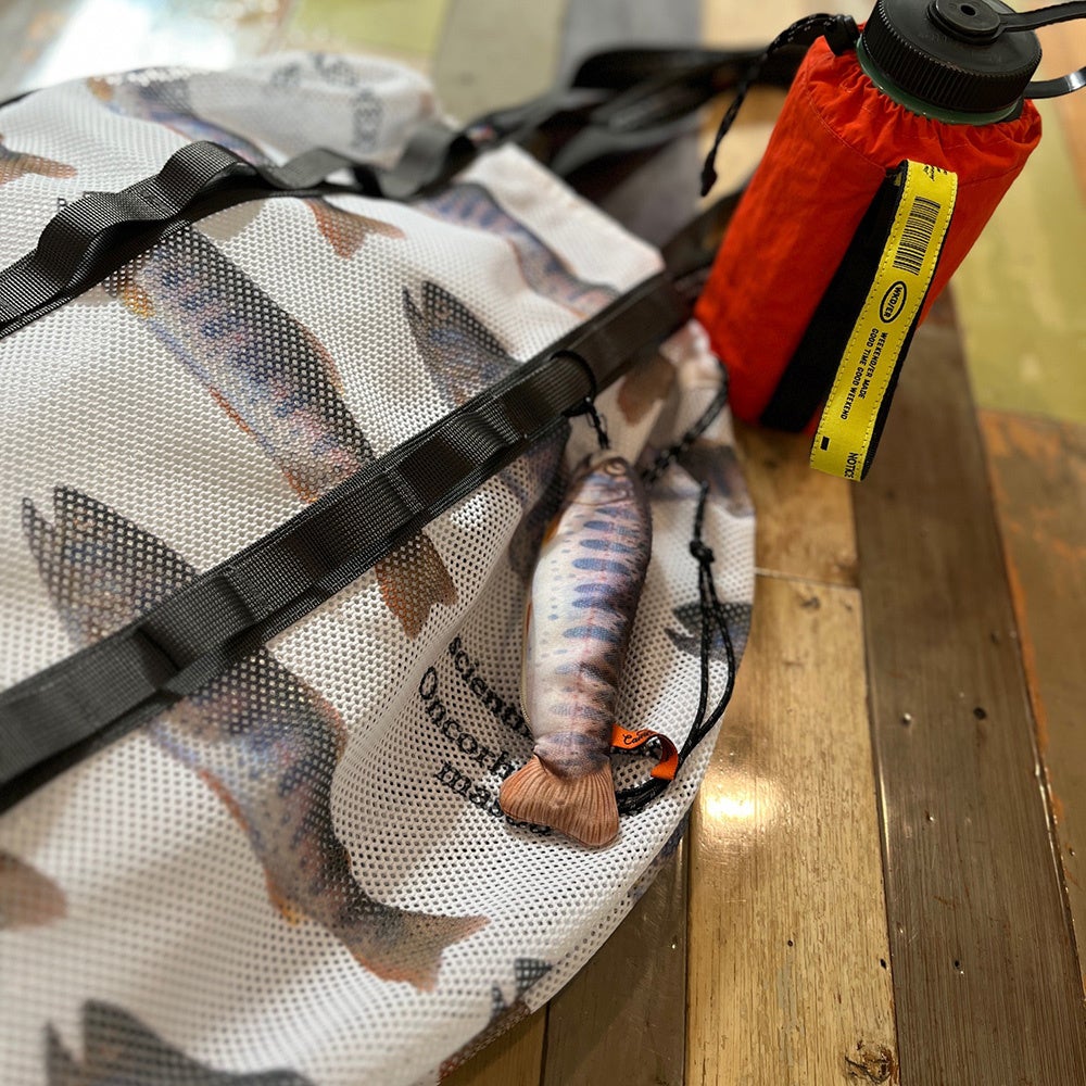 ヤマメを全面プリントした目の細かなメッシュ素材に、オリジナルロゴ&毛針デザインの織テープハンドル、トートバッグにはハンドルからつながるウェビングを施し、使い勝手にもデザインにもこだわったシリーズです。