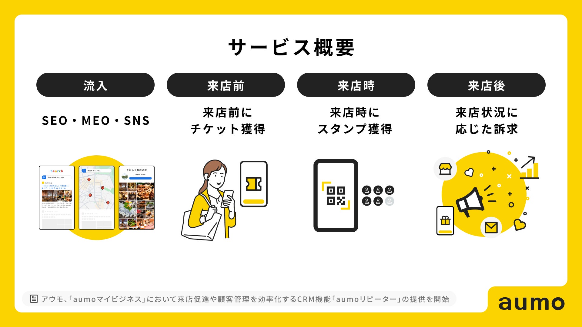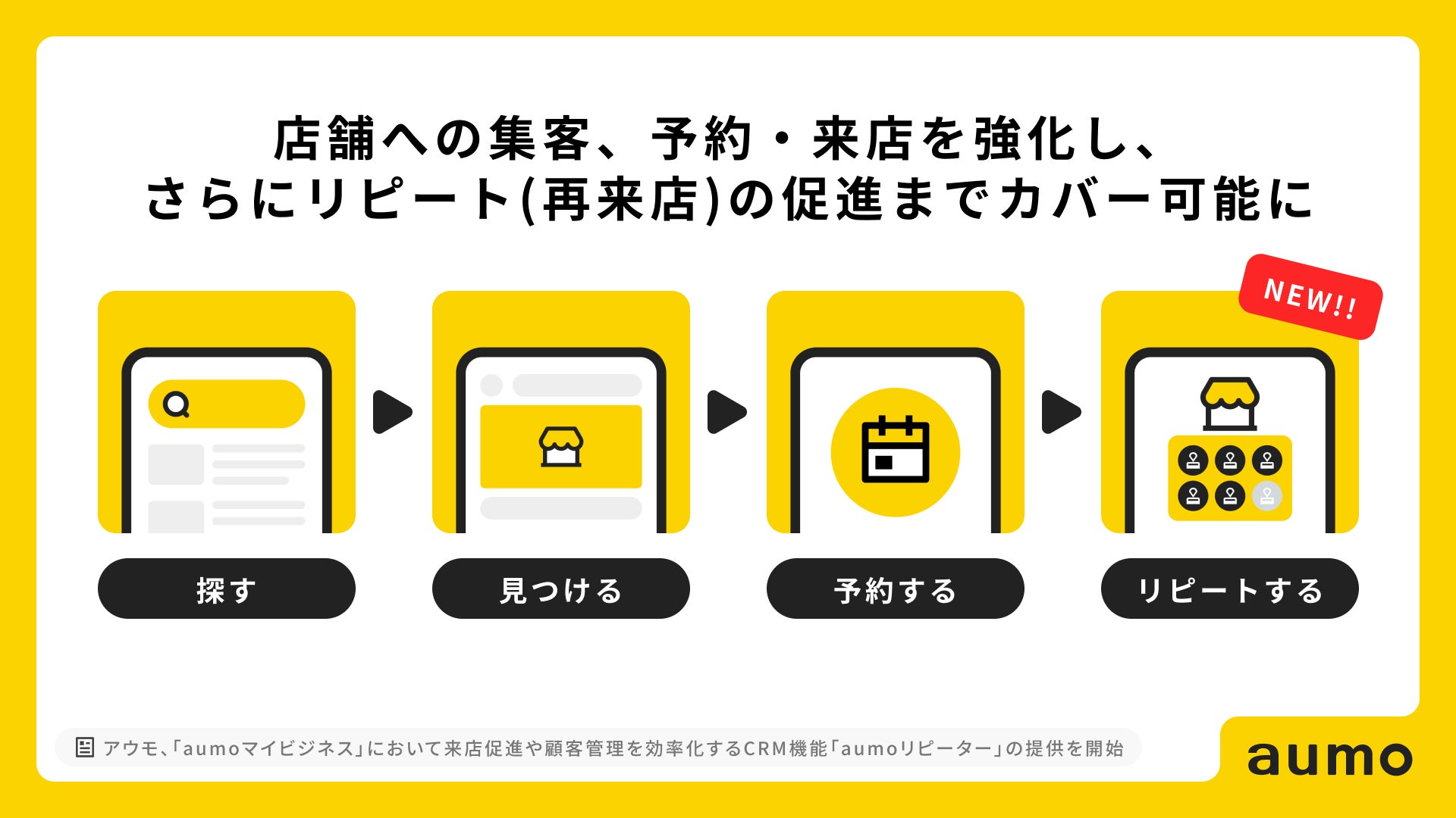 「aumoマイビジネス」の新機能として、導入店舗への来店促進や顧客管理を効率化するCRM機能「aumoリピーター」の提供を開始することで、店舗への集客、予約・来店を強化し、さらにリピート(再来店)の促進に至るまで、ユーザーの来店行動に関わる全てのプロセスでアプローチできるようになります。