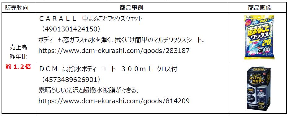 洗車用品では簡単にふき取りができる洗車シートやボディーを保護するコーティング剤が伸長しています。